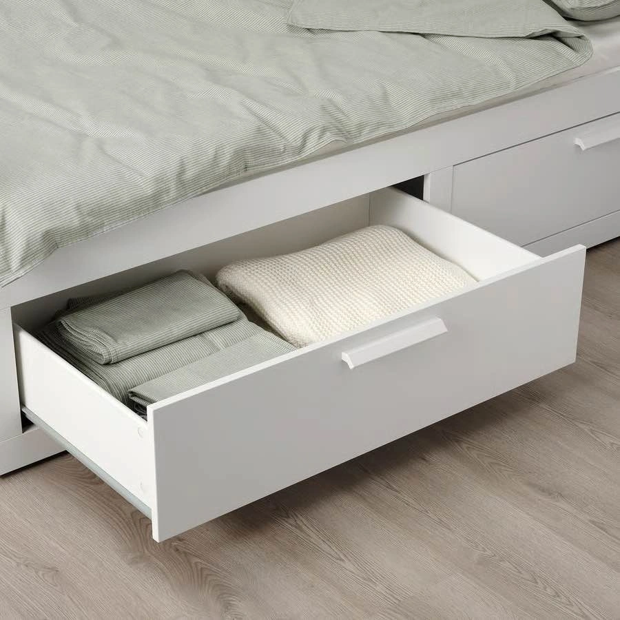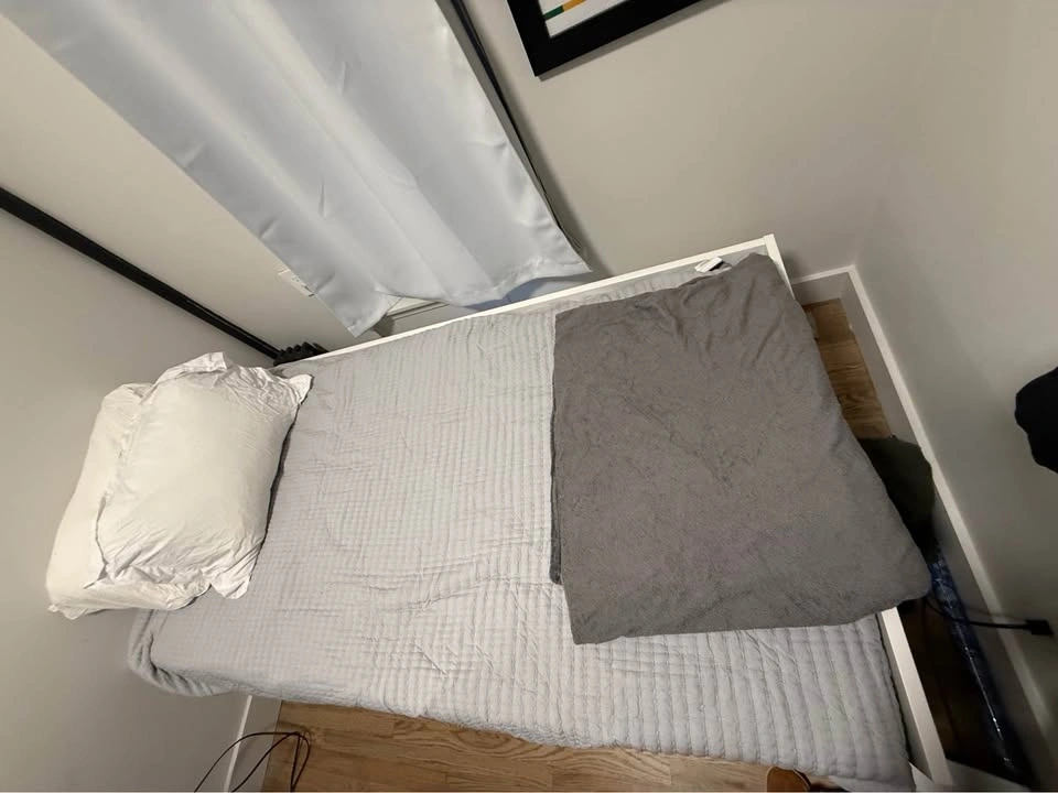 Perfect for a guest room, studio apartment, or kid’s room. This is a 3-in-1 setup: sofa by day, single bed at night, or pull out the base for a full double bed when guests stay over. Both VANNAREID pocket spring mattresses included. Two large storage drawers underneath for sheets, pillows, or whatever you need to hide away. White frame, minor wear consistent with normal use — nothing structural, looks great. Dimensions: 41” wide as sofa / 78” wide as double bed, 76” long. Buyer must disassemble and haul. I can help load. Pickup in East Village.