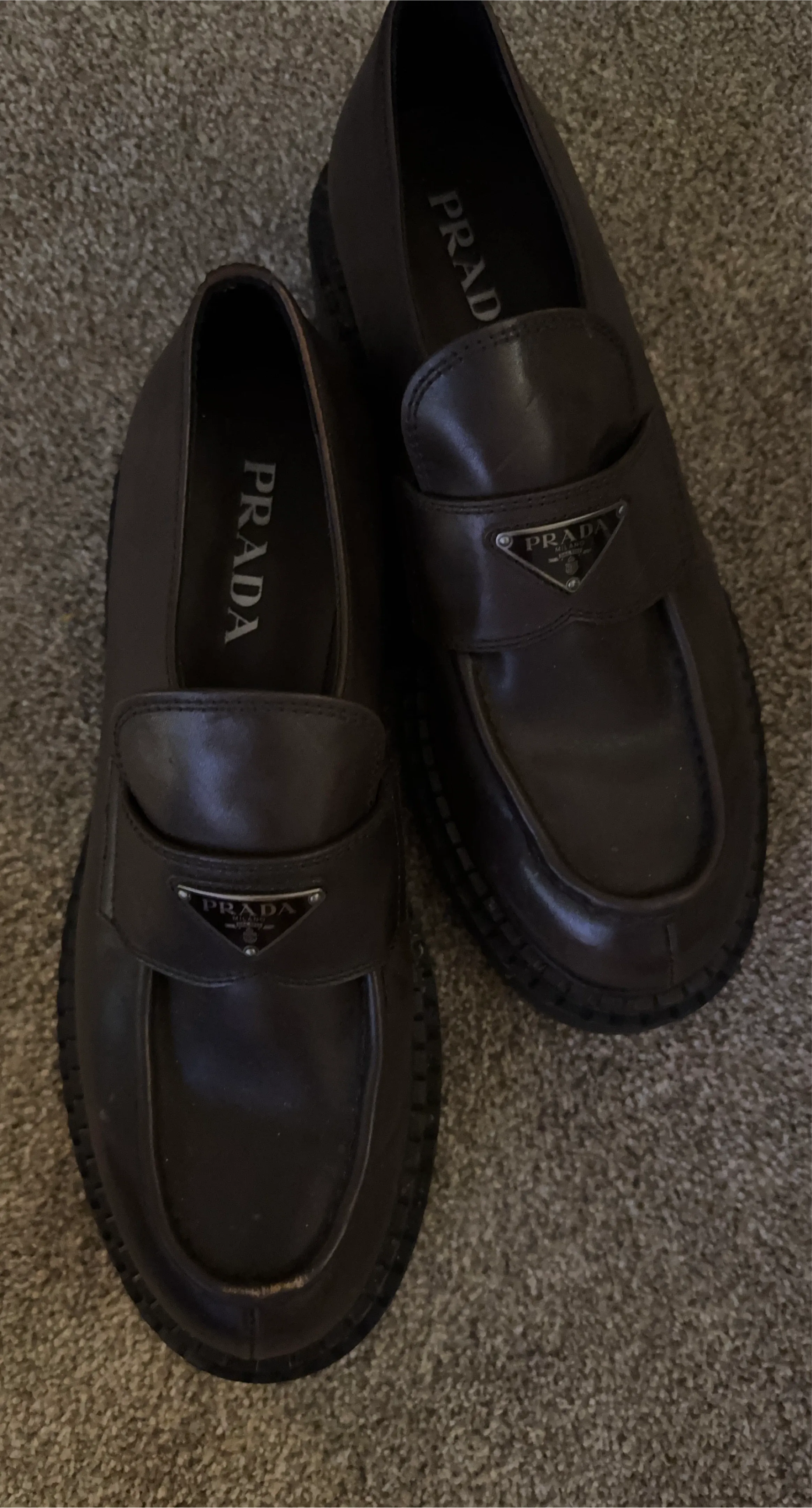 Classic Prada dark brown leather loafers. Features the iconic Prada triangle logo emblem. These shoes have a durable sole and a stylish penny loafer design.