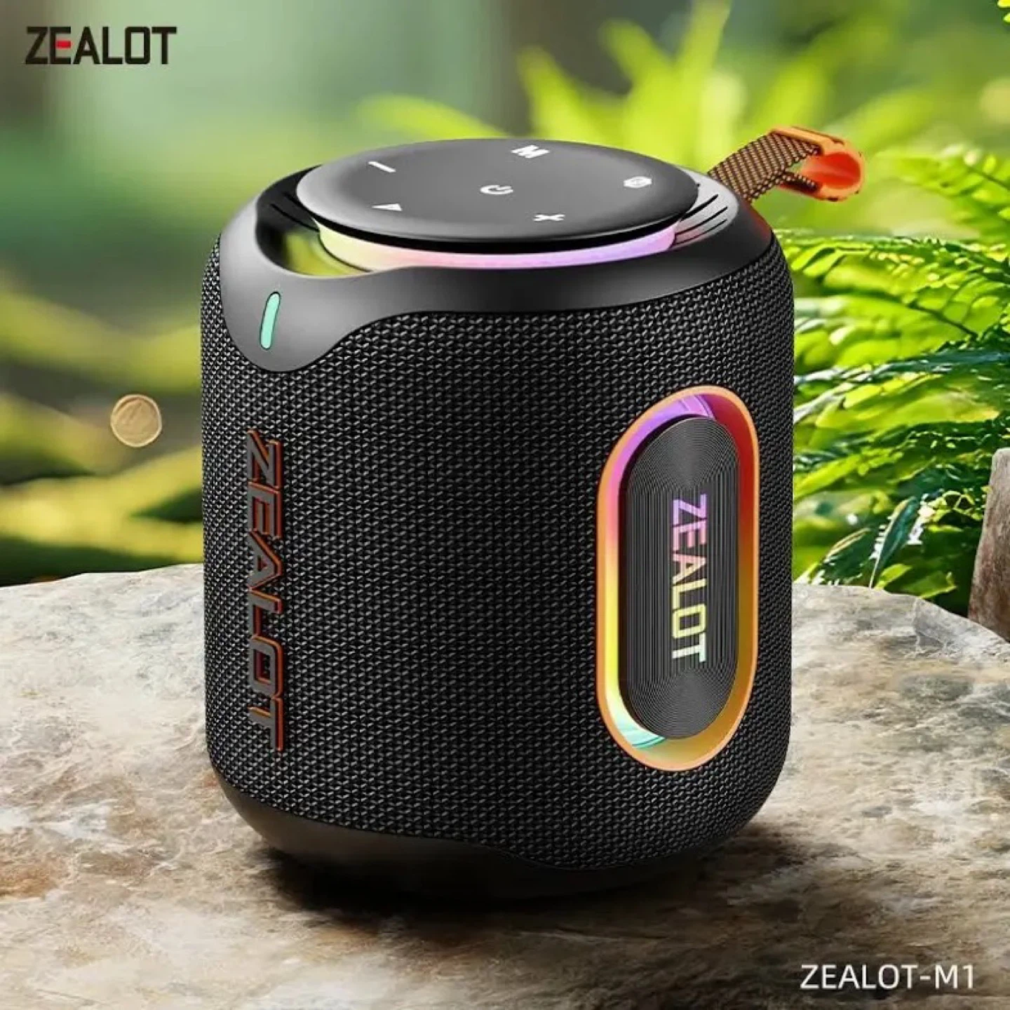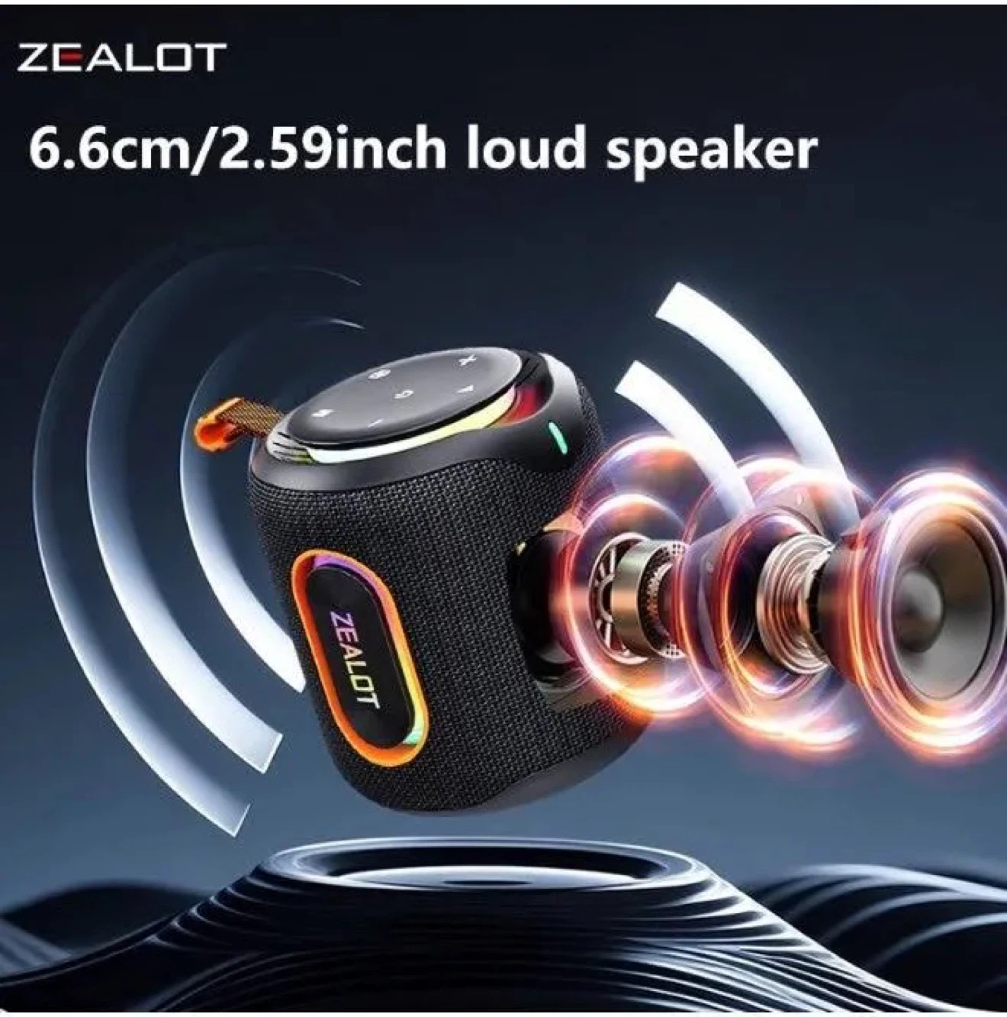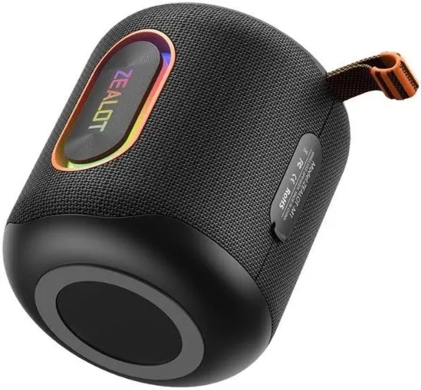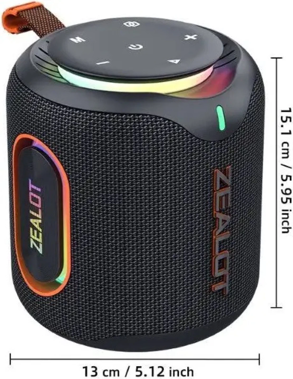 Portable Zealot Bluetooth speaker with LED accent lighting. It's 15.1 cm tall and 13 cm wide. This loud speaker offers surround sound.
