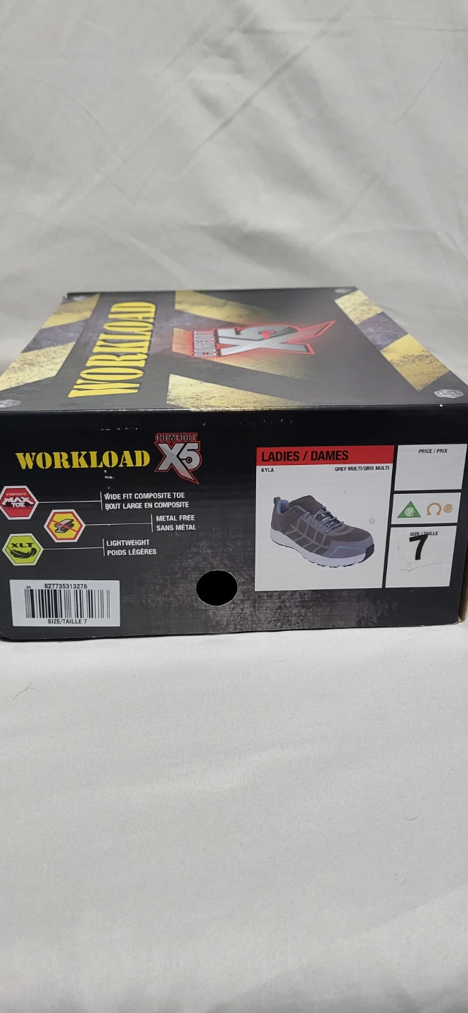 These Workload Jogger safety shoes are perfect for on-the-job protection! They are a ladies size 7. The shoes are grey with blue accents. The shoes feature a wide-fit composite toe and are metal-free. They are also lightweight for all-day comfort. Shoes are in great like a new condition. The original box is included!