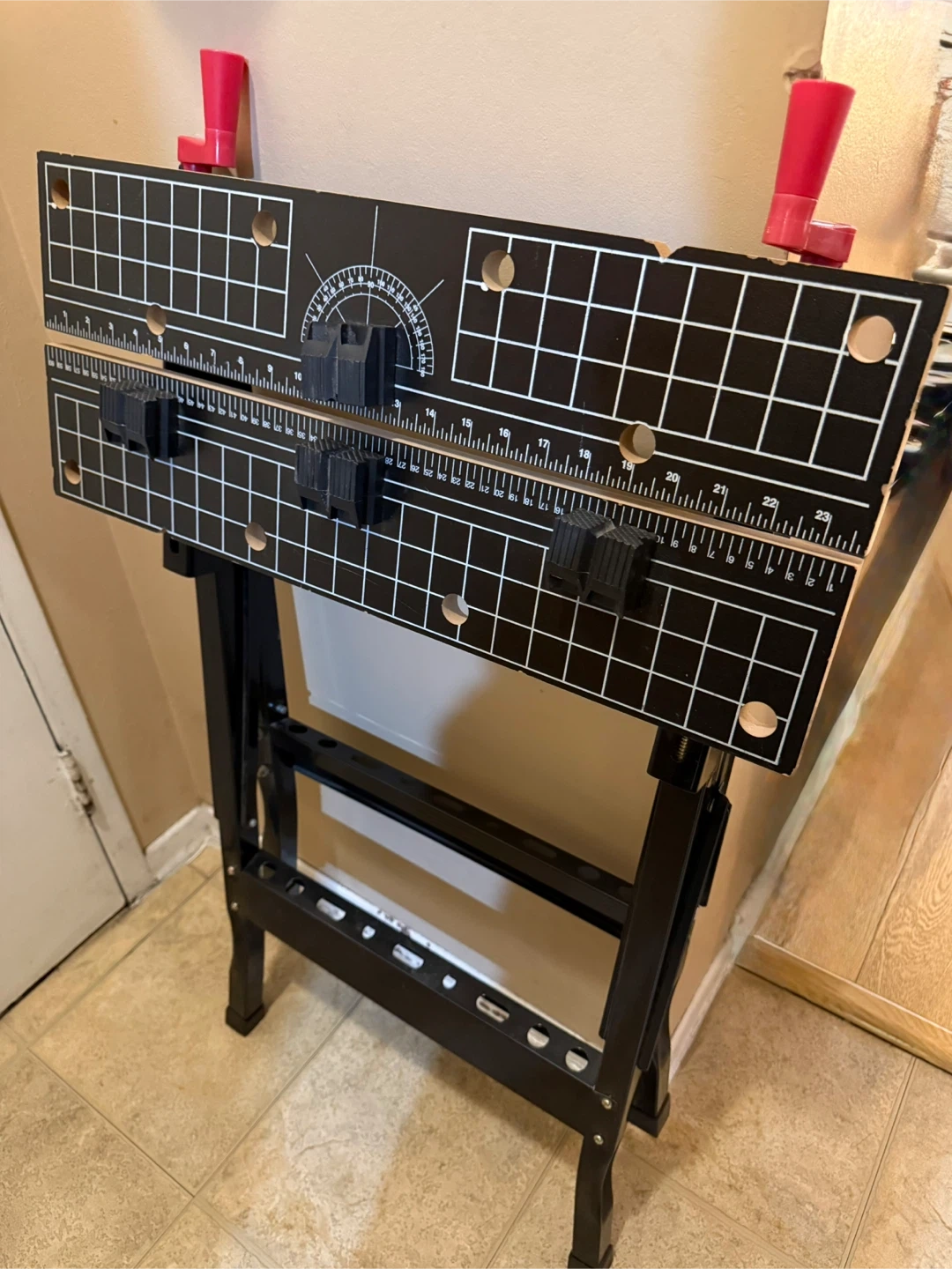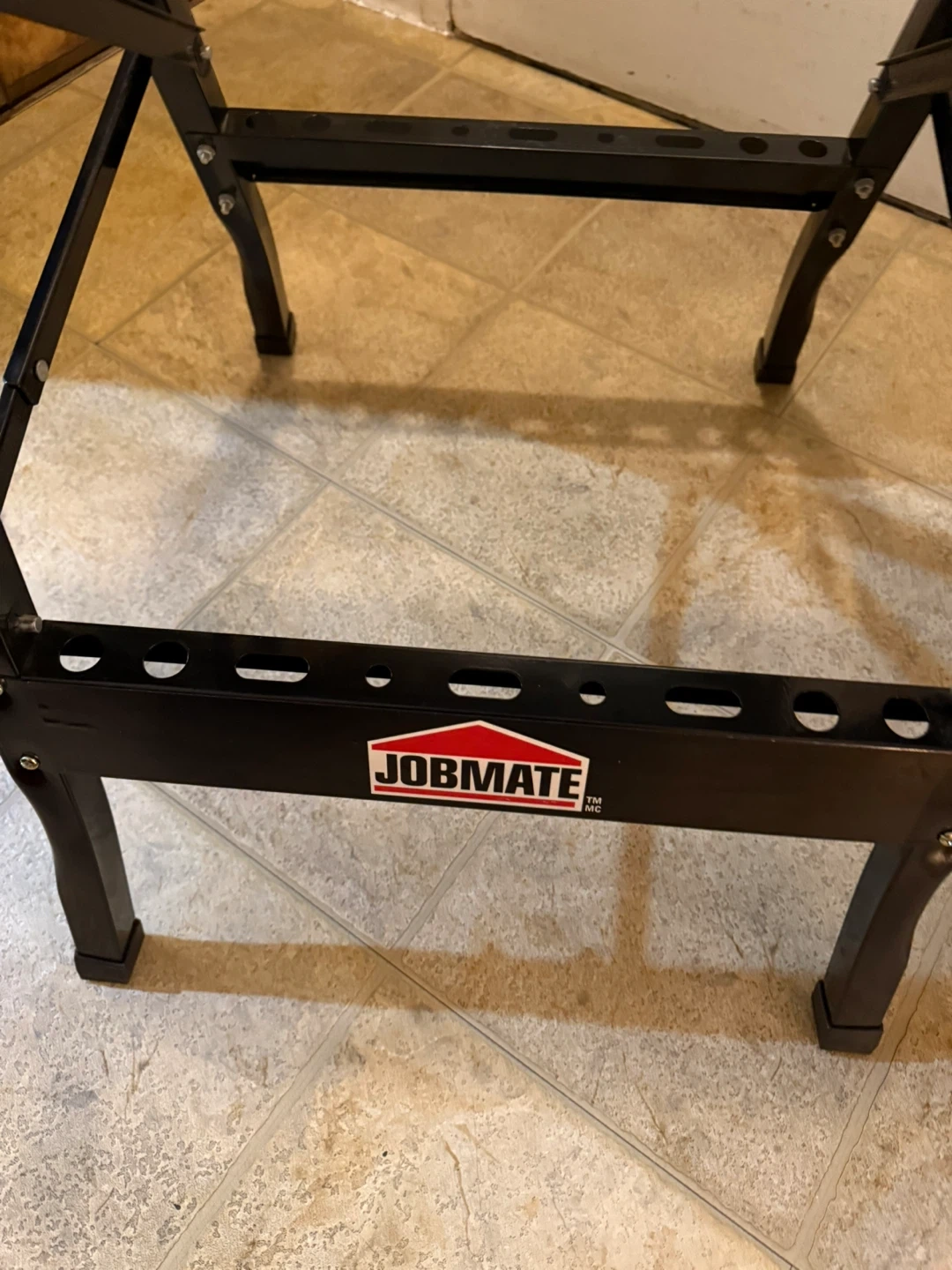 Jobmate work bench in like new condition. Used only once. It's black with a gridded work surface and red plastic clamps used to widen the bench surface or to make it narrow. Great for projects around the house! Foldable for easy storage. Black metal frame. Two-piece work surface with rulers and measuring guides.