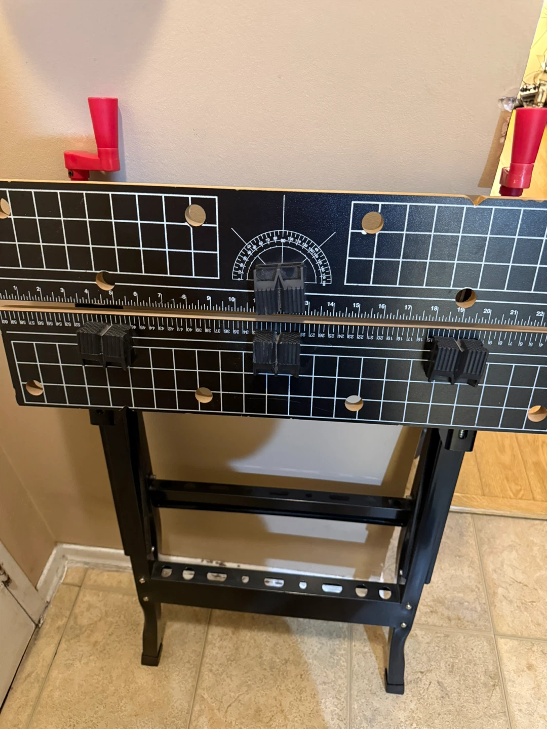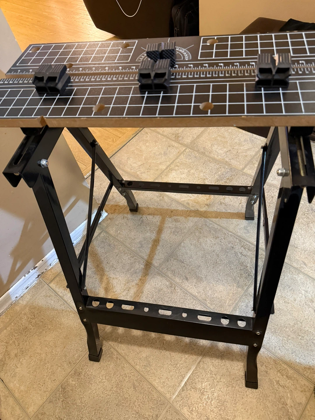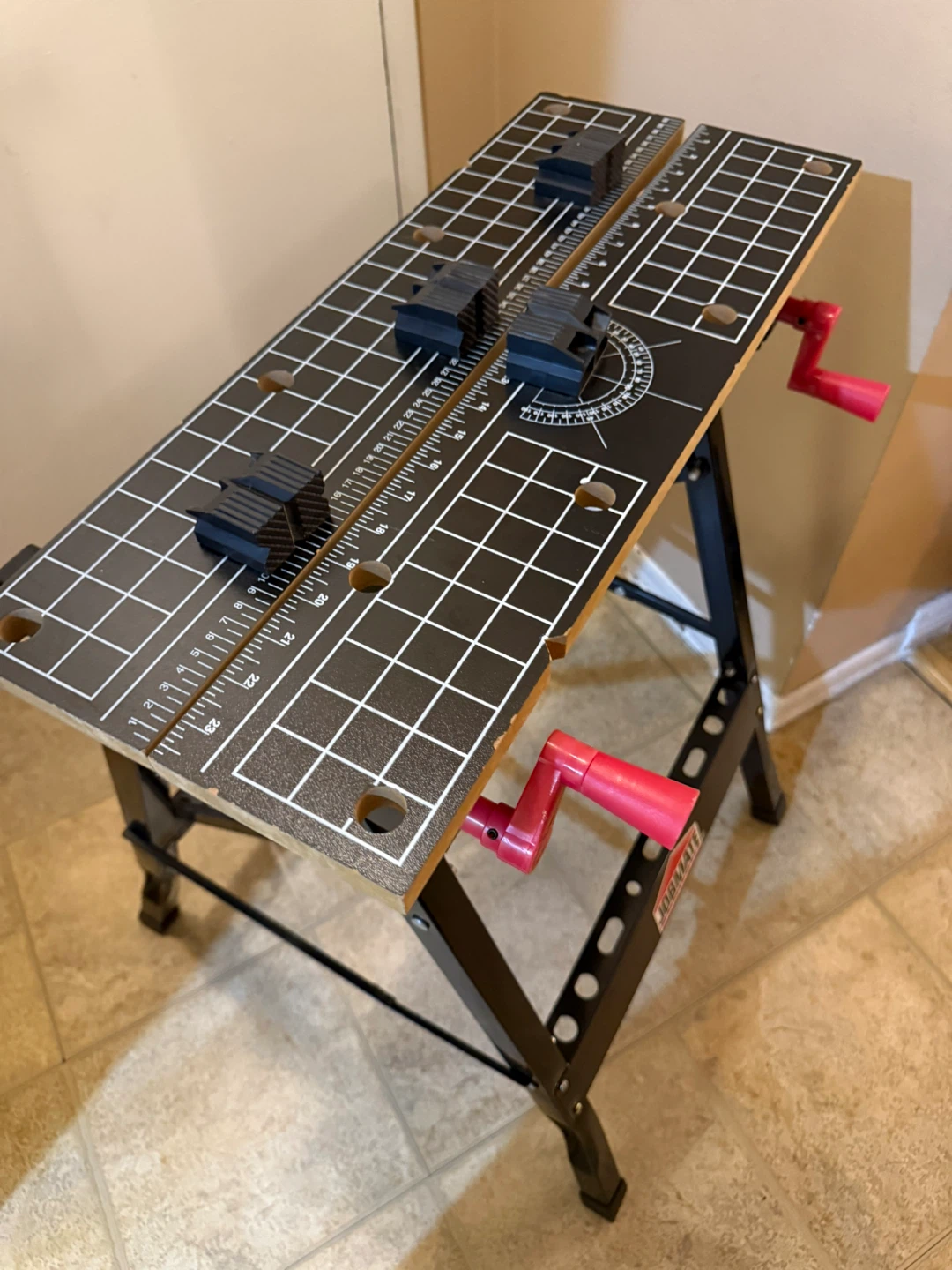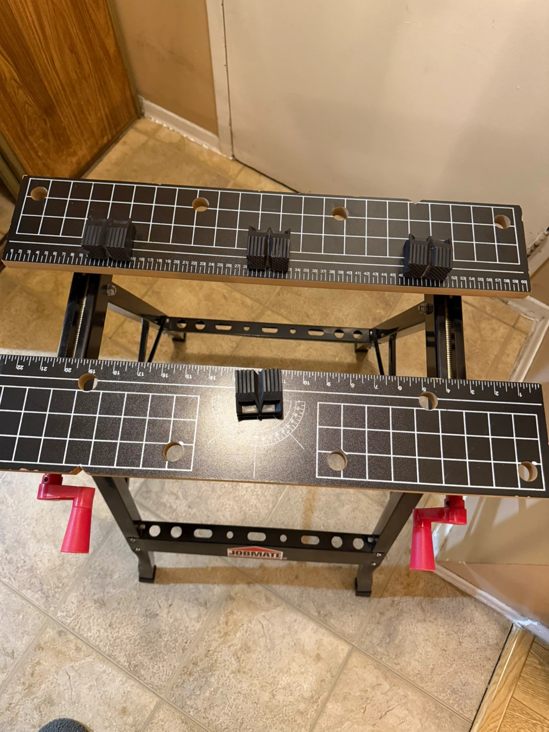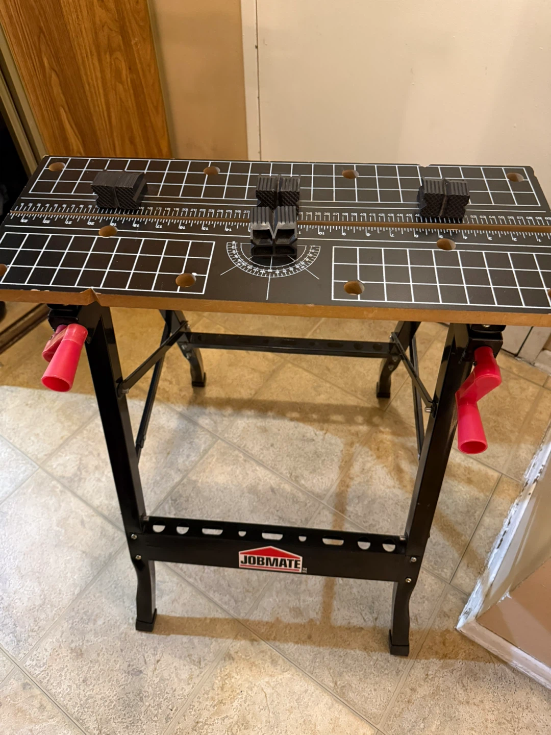 Jobmate work bench in like new condition. Used only once. It's black with a gridded work surface and red plastic clamps used to widen the bench surface or to make it narrow. Great for projects around the house! Foldable for easy storage. Black metal frame. Two-piece work surface with rulers and measuring guides.