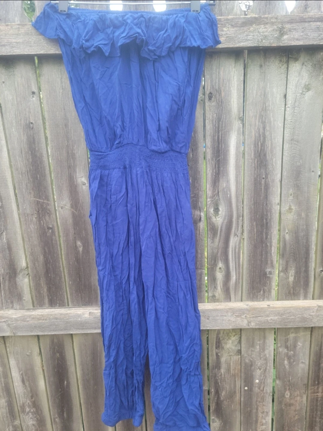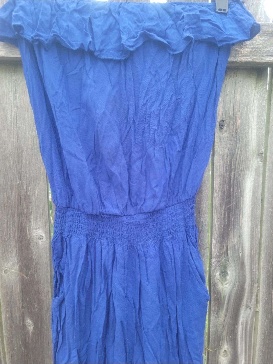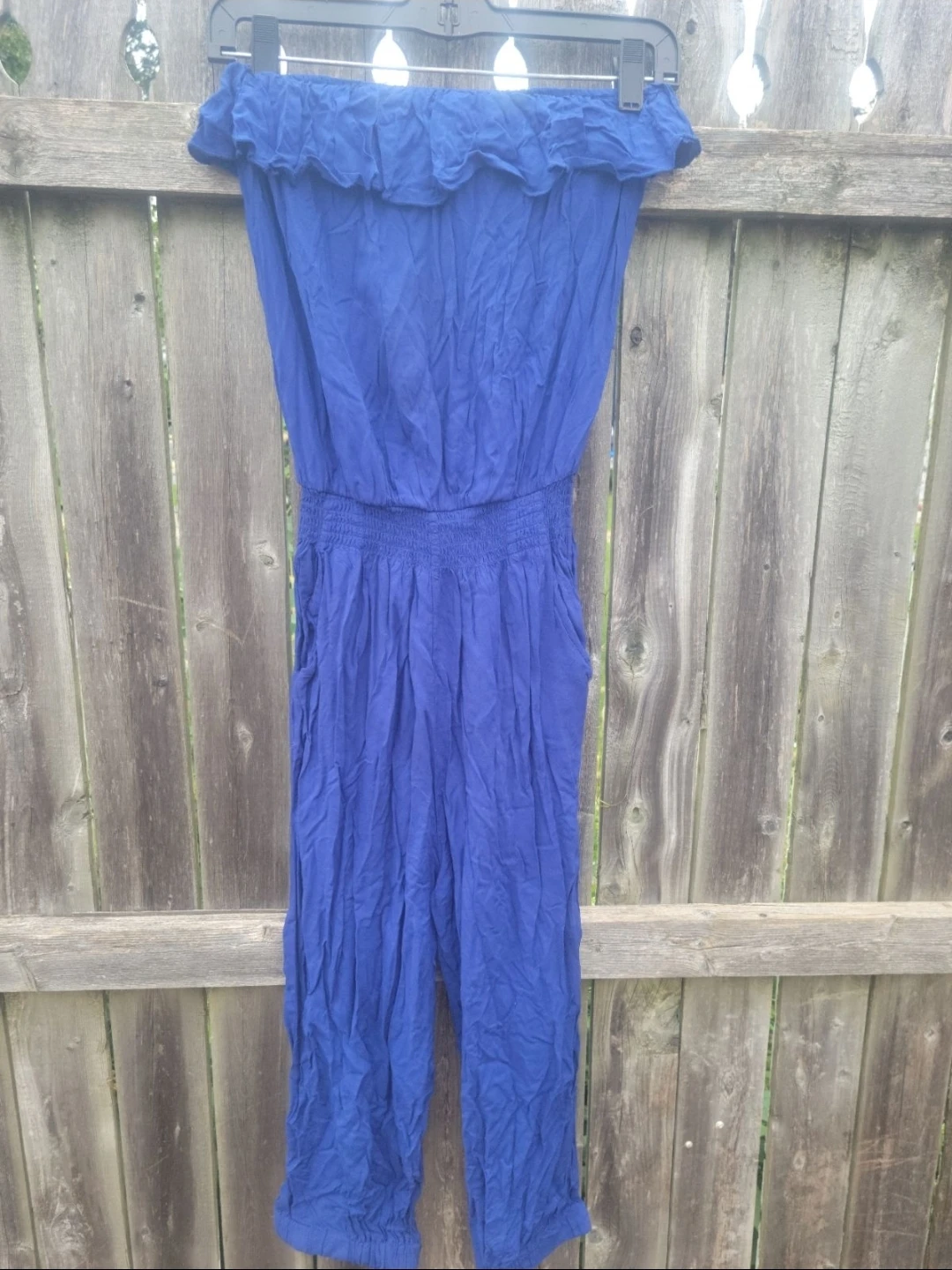 This blue strapless jumpsuit features a ruffled neckline and a smocked waist. It has pockets and a relaxed fit. Made from a lightweight fabric.