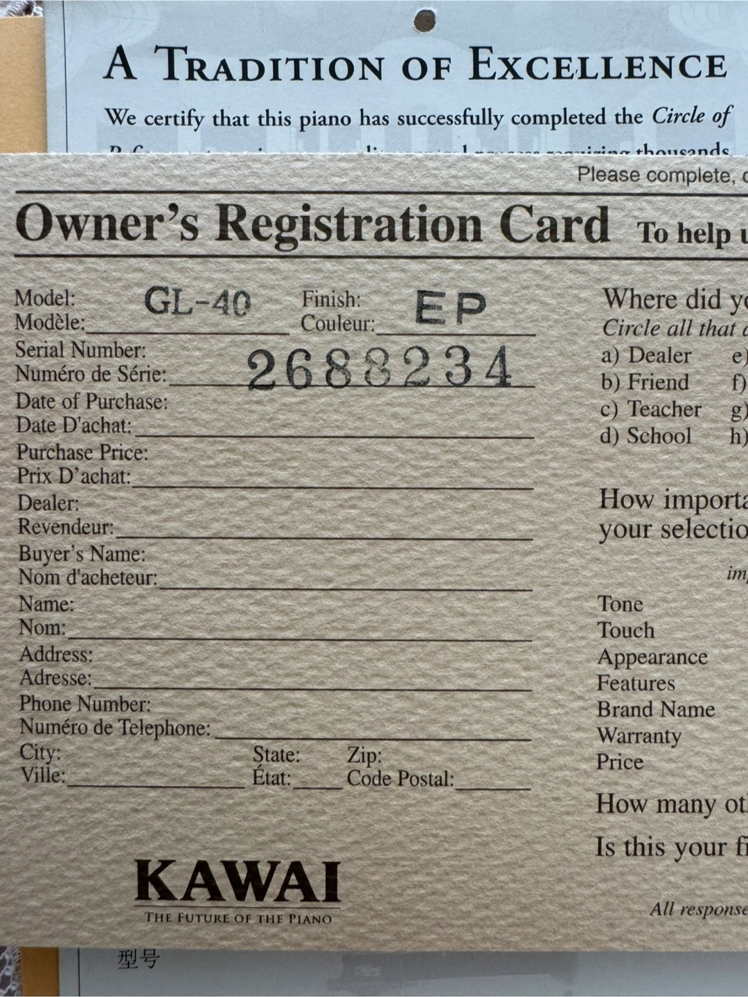65Selling a beautiful K. Kawai GL-40 grand piano in excellent condition! This piano has a sleek black finish and comes with the matching bench. It’s ready to bring music into your home!