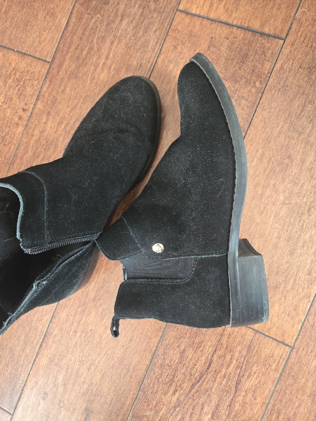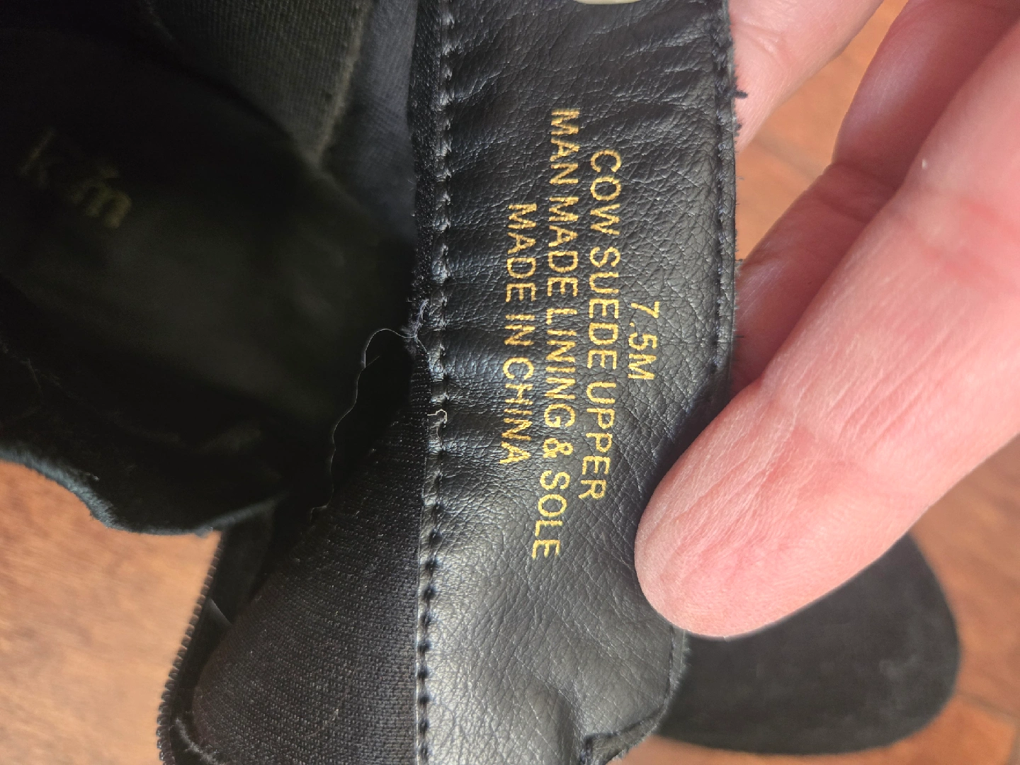 Selling a pair of K&M ankle boots in black suede! They're a size 7.5M and feature a convenient zipper. The upper is cow suede, and the lining and sole are man-made.