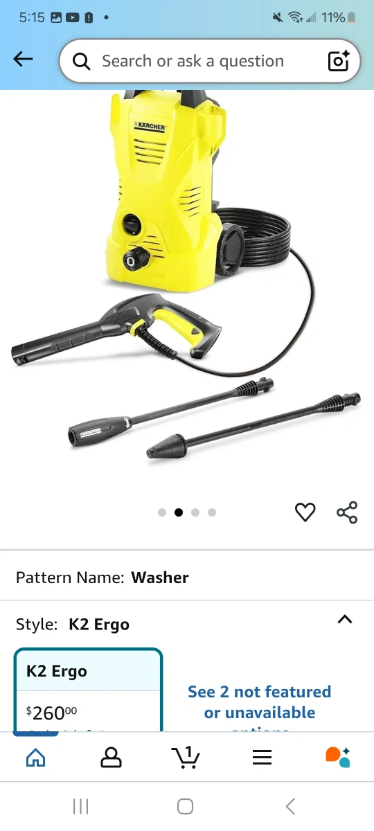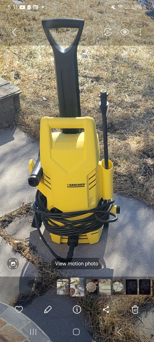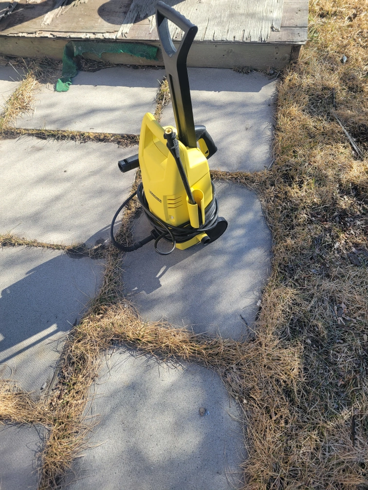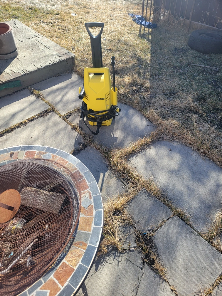 Yellow pressure washer. Includes wand and cord. Good for cleaning patios, decks, and other outdoor surfaces.