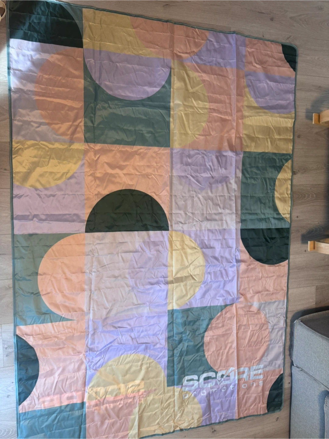 Selling a picnic blanket from Score Promotions. It's lightweight and portable, perfect for outdoor activities. The blanket features a colourful geometric pattern. It's in great condition and ready for your next picnic!