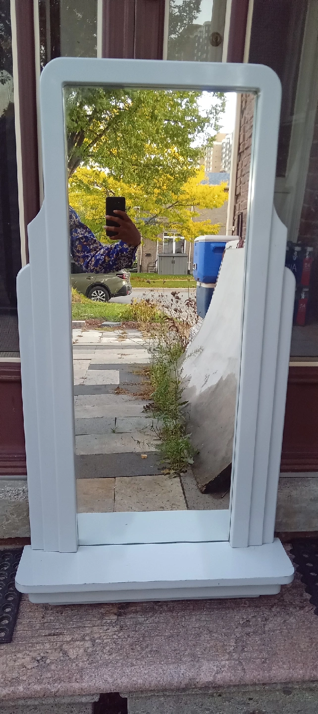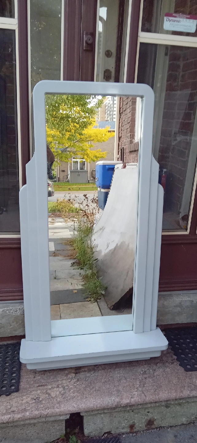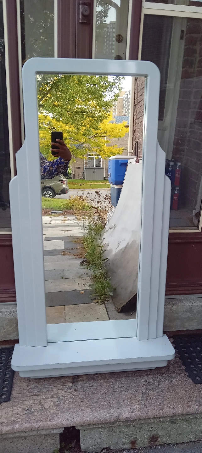 Here's a standing mirror with a white frame! It's in used condition, as shown in the photos, but still has lots of life left in it. Perfect for adding a touch of style to any room