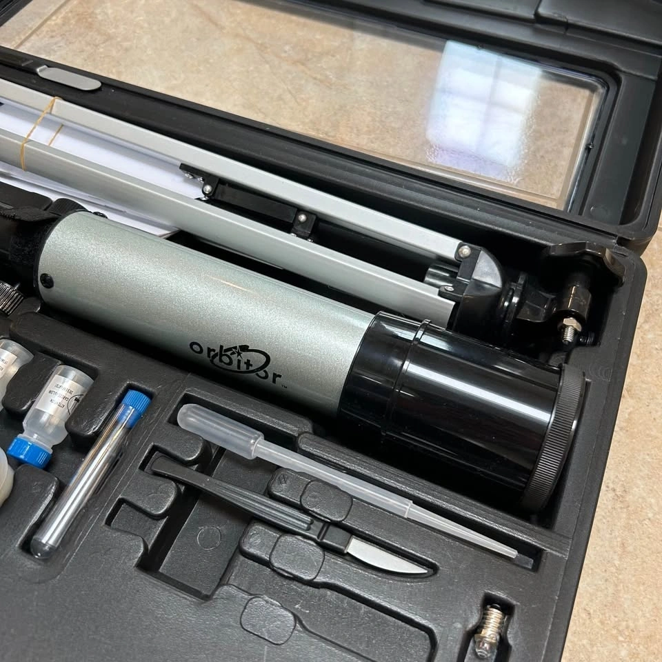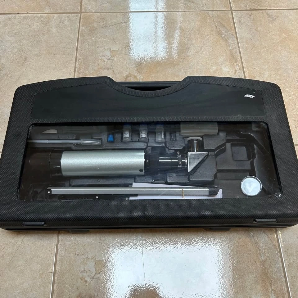 Barely used metal telescope and microscope kit. Diecast metal 1200x microscope with electric illuminator, mirror illumination and complete slide preparation kit with 300x, 600x and 1200x magnifications. 90x metal tube telescope with 50mm optical lens.