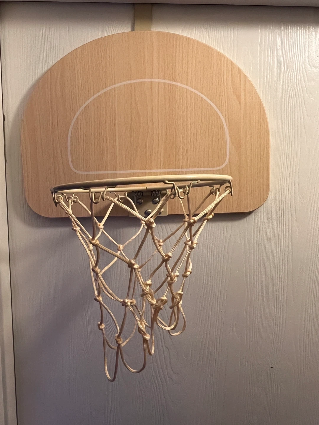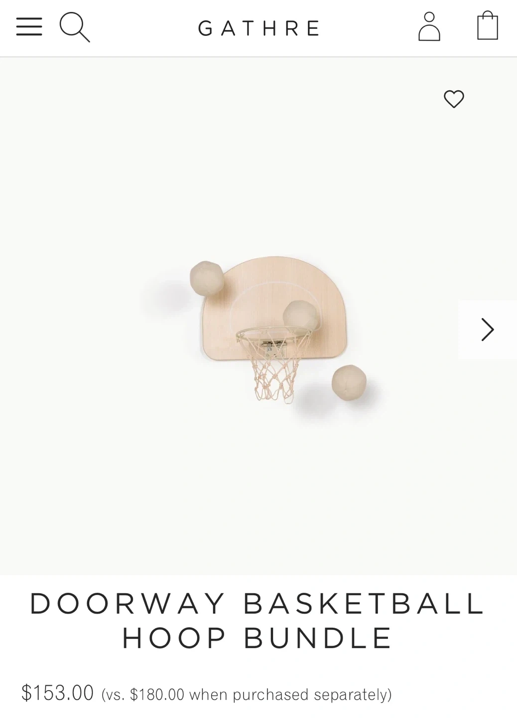 This is the GATHRE Doorway Basketball Hoop Bundle, including the hoop and three mini basketballs. The hoop is made of wood with a light wood finish and includes a white net. It's designed to be hung on a doorway. It's fun for kids and adults alike!
