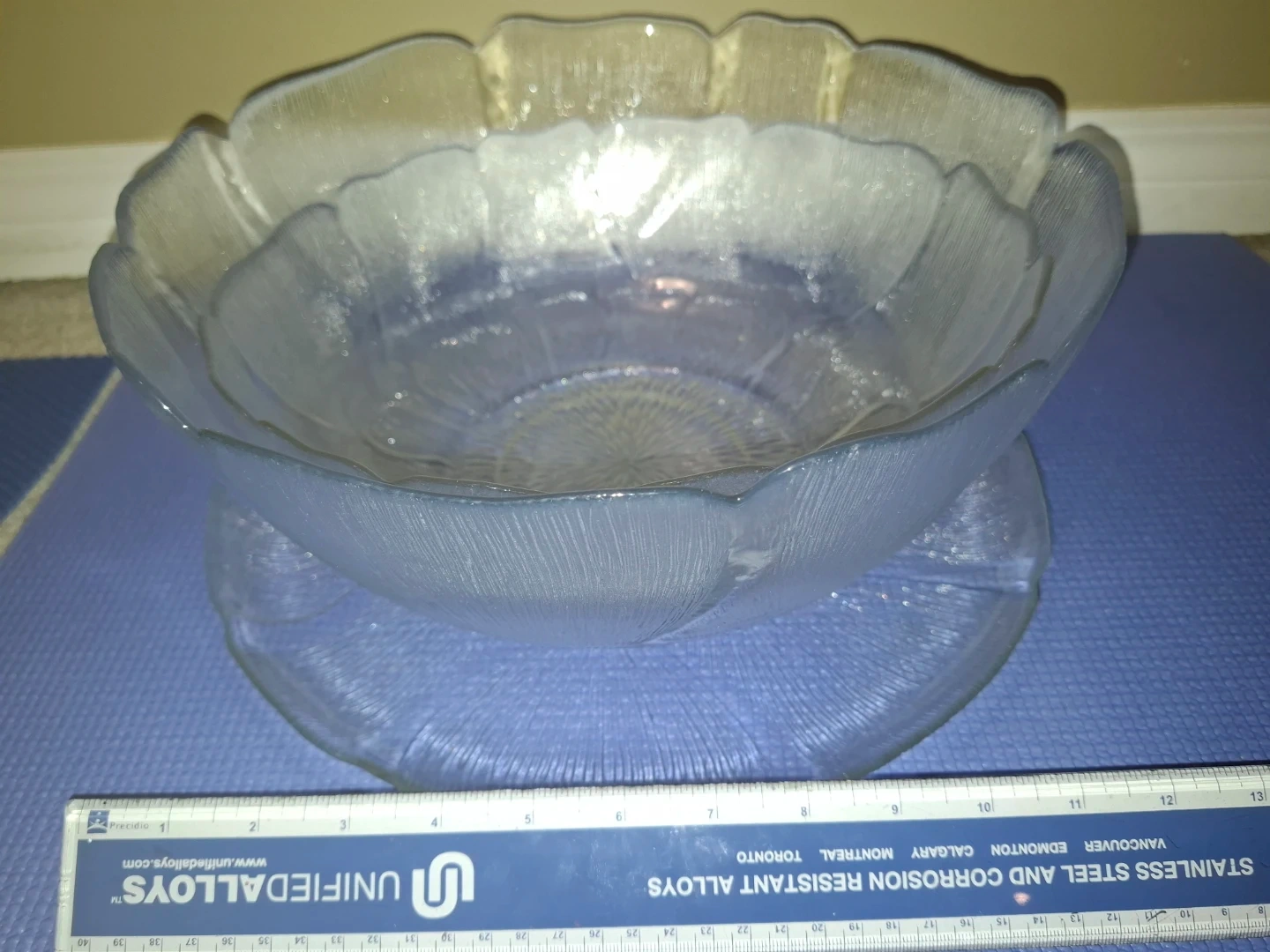 Beautiful frosted glass serving set with a stunning floral petal design. The textured "ice" finish adds a sophisticated and refreshing look to your summer dining table. Set Includes: 2 Nesting Serving Bowls (Large & Medium) and 1 Coordinating Large Platter. Great for hosting garden parties, weddings, or everyday use.