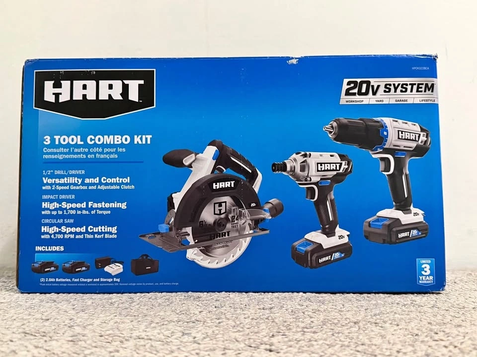 Packed box includes: 1 impact driver with 1700lb of torque, 1 drill with 2 speed adjustments, 1 cutting saw with a blade, 2 batteries (2 Ah), 1 fast charger, and 1 storage bag. Comes with a 3-year warranty.