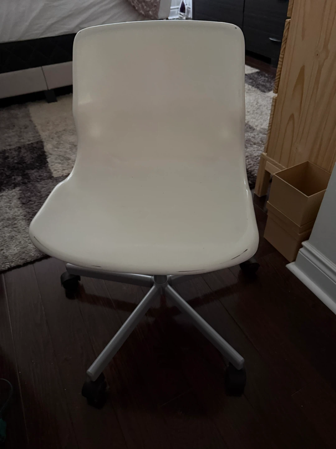 Selling a white IKEA Vilgot swivel chair! It's perfect for a home office or study space. The chair has some minor wear and tear, but is still in good working condition and ready for a new home. The chair is a great addition to any room!