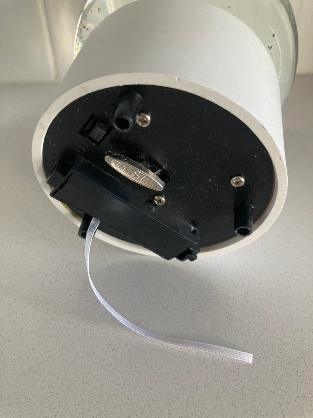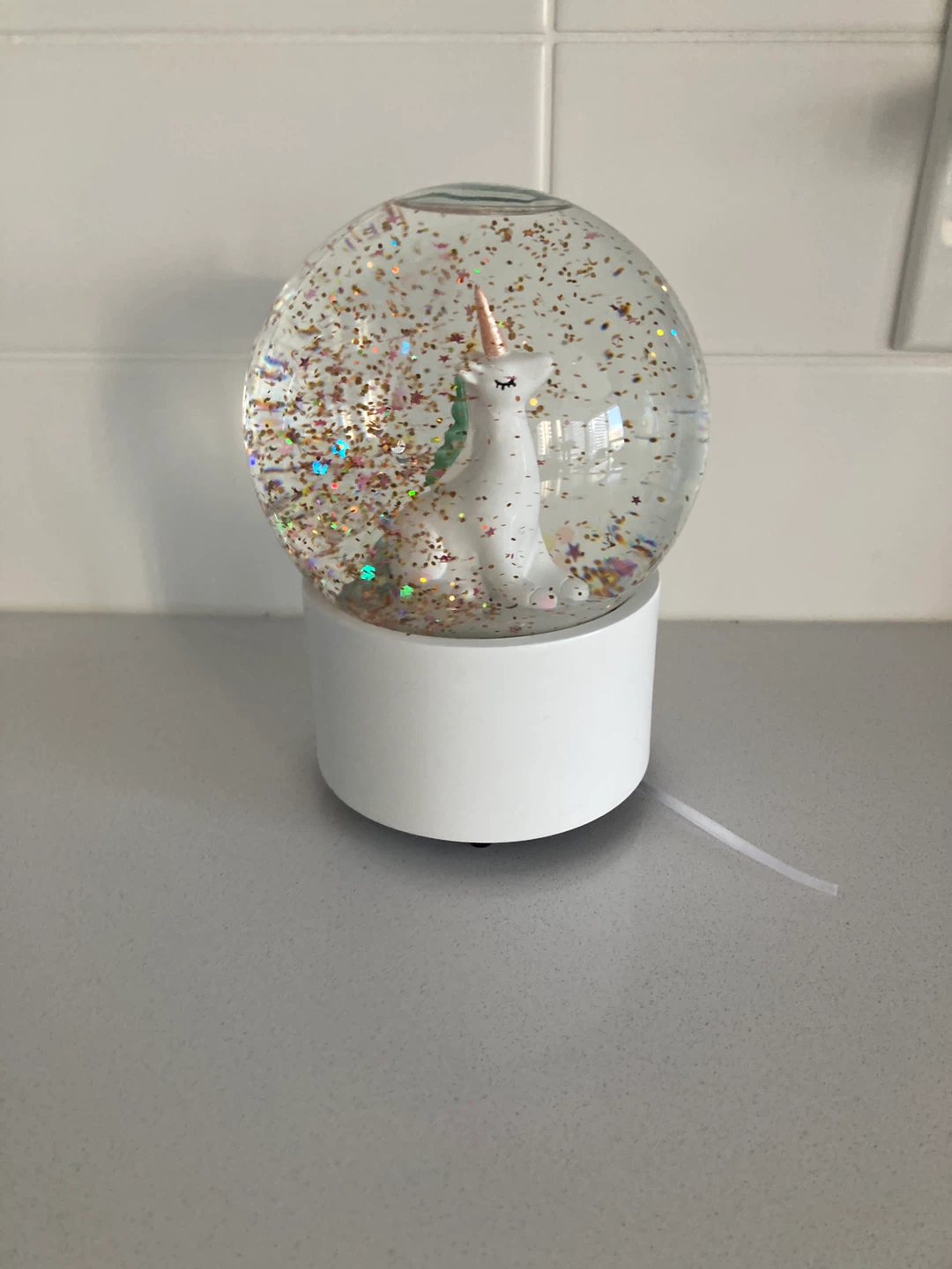 A cute snow globe featuring a white unicorn with colourful glitter. The base has a music box mechanism. It's perfect for adding a touch of whimsy to any room!