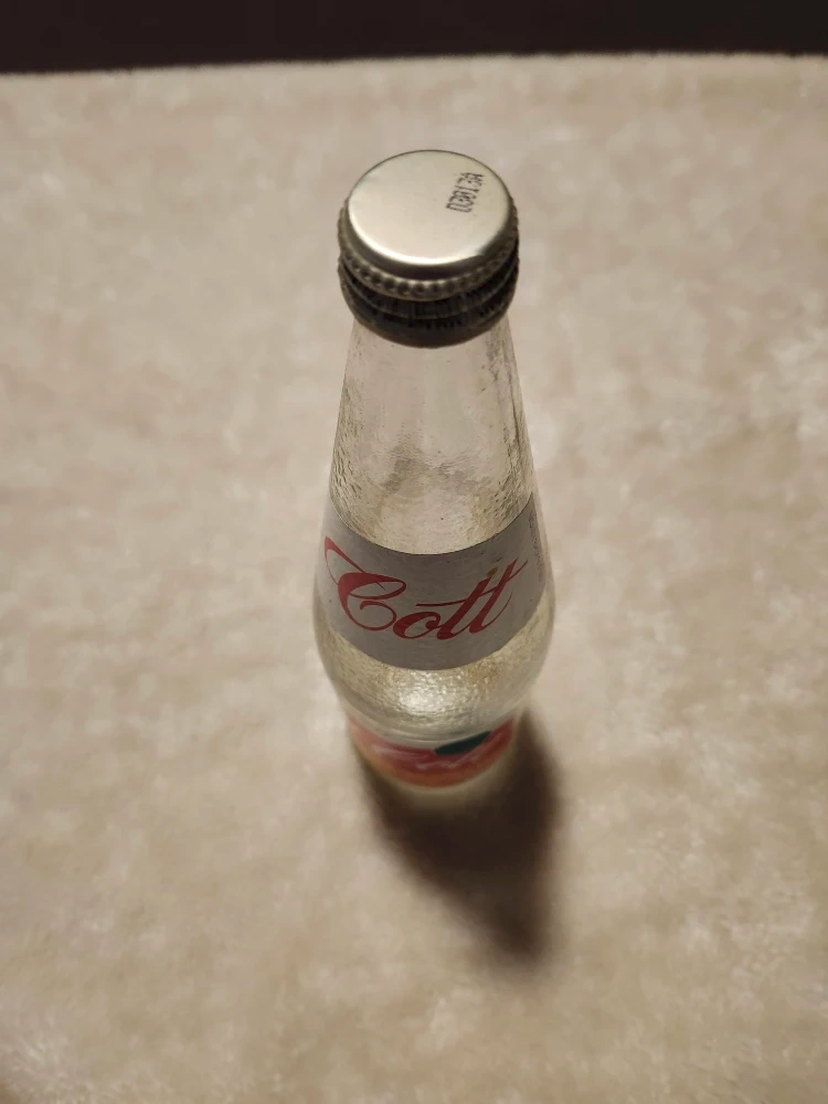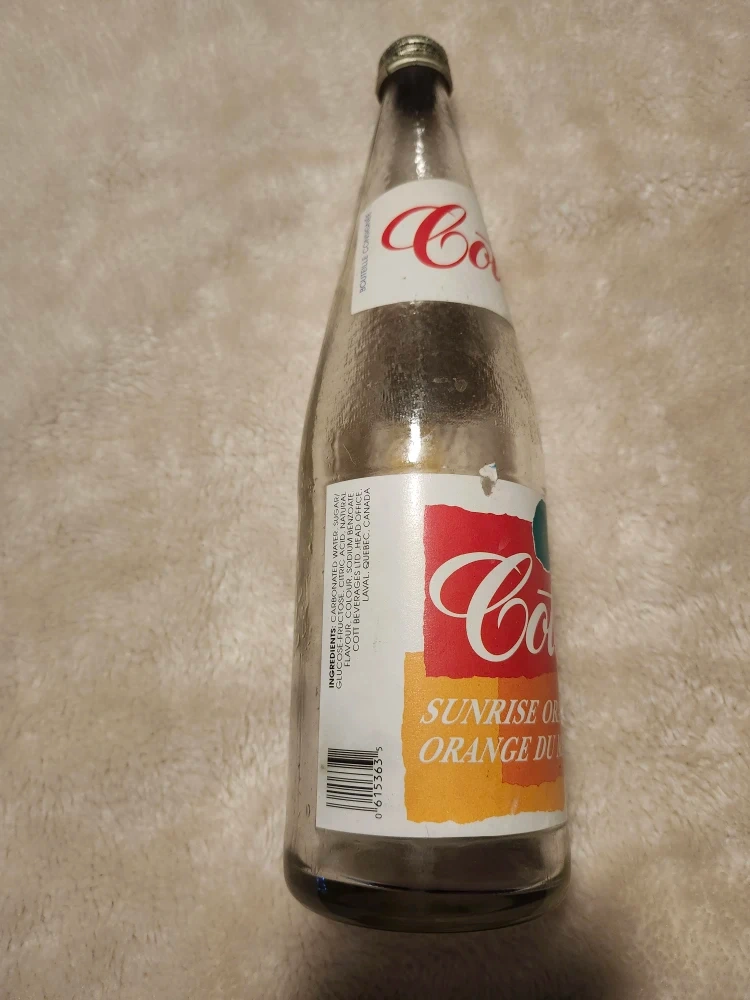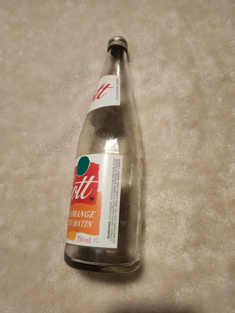 Selling an empty vintage Cott Sunrise Orange soda bottle. It's a 750 mL glass bottle with the classic Cott logo and Sunrise Orange design. Perfect for collectors or anyone looking for a nostalgic piece!