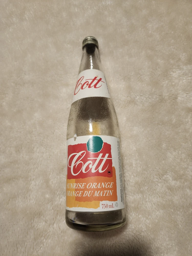 Selling an empty vintage Cott Sunrise Orange soda bottle. It's a 750 mL glass bottle with the classic Cott logo and Sunrise Orange design. Perfect for collectors or anyone looking for a nostalgic piece!
