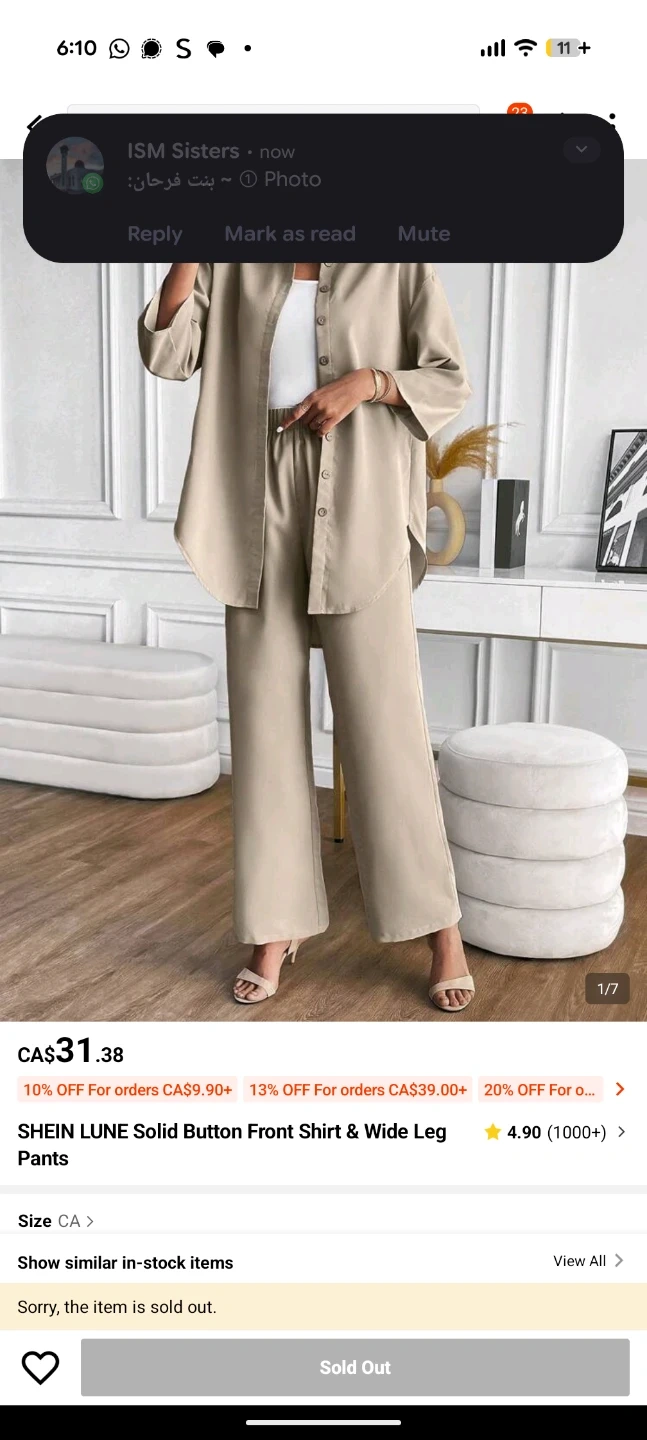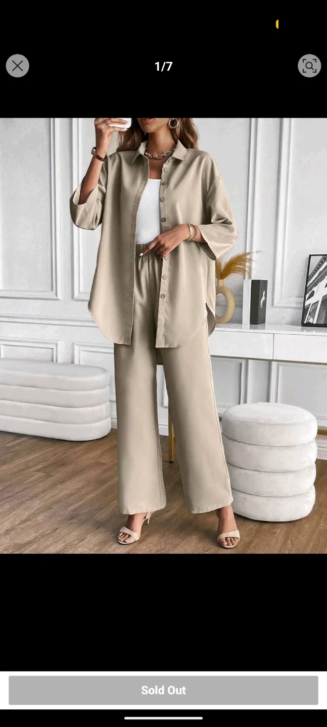 A stylish two-piece set featuring a solid button-front shirt and matching wide-leg pants. It's made from a flowing material. This outfit is great for casual outings or dressing up!