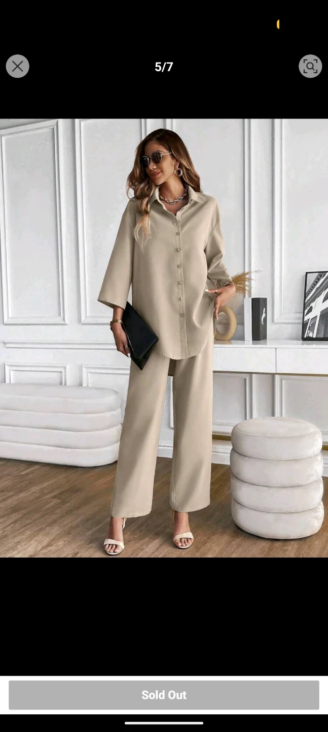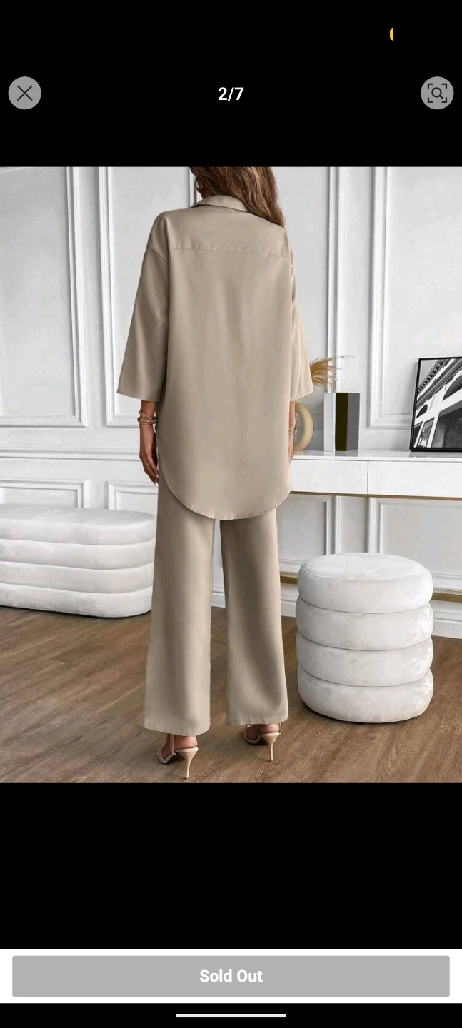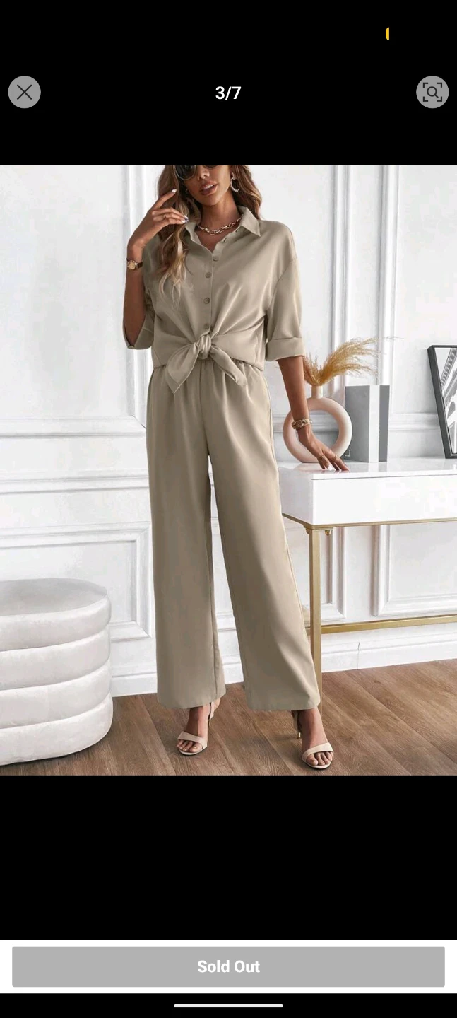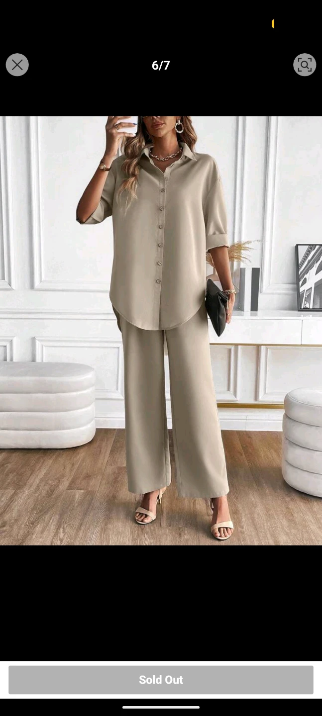 A stylish two-piece set featuring a solid button-front shirt and matching wide-leg pants. It's made from a flowing material. This outfit is great for casual outings or dressing up!