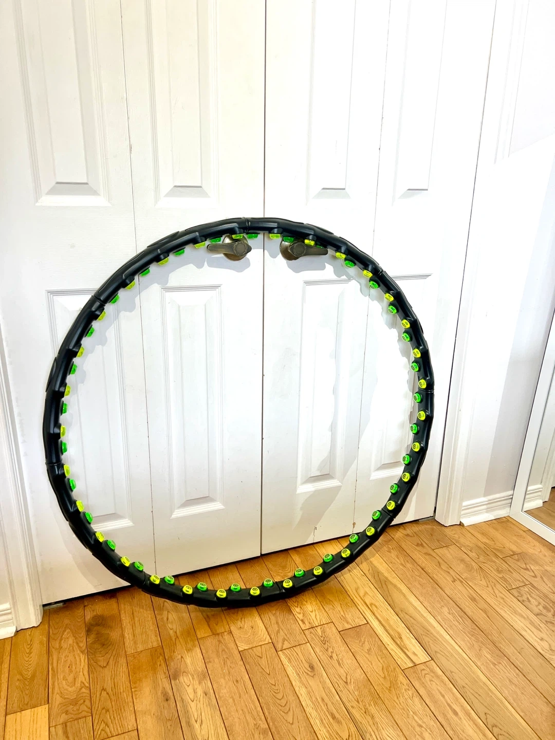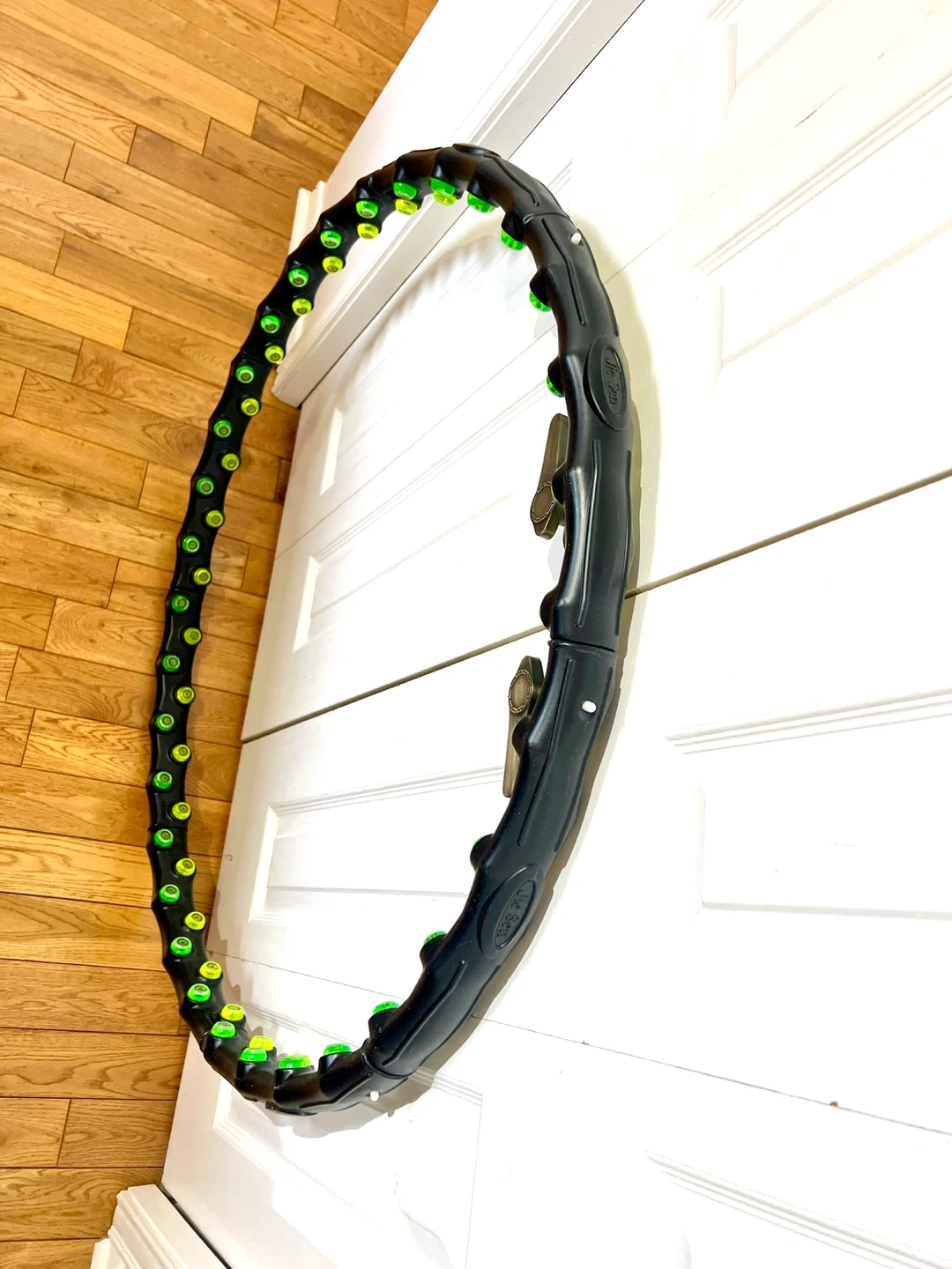 This is an adjustable fitness hula hoop with weighted massage balls. It's designed for core workouts and can be assembled in different sizes. The hoop is black with green and yellow massage nubs.