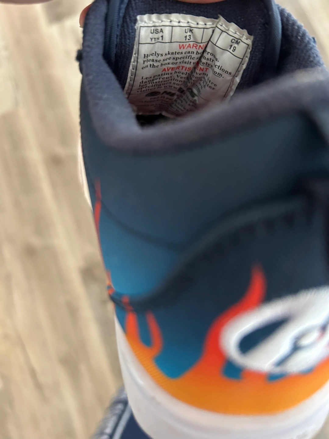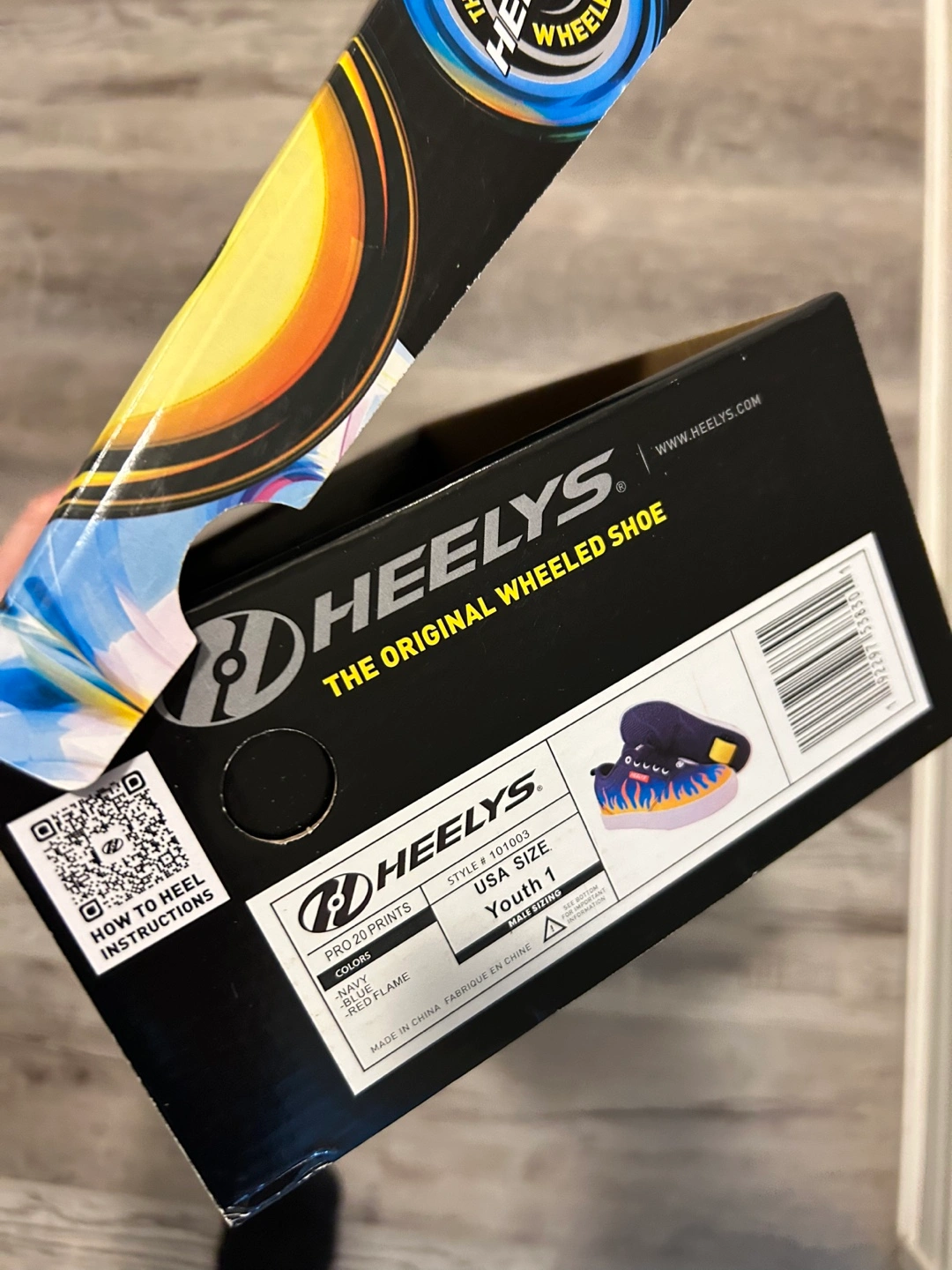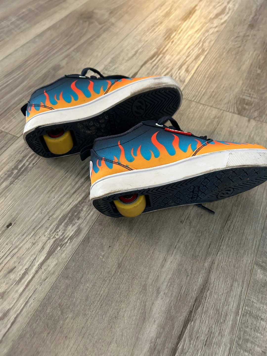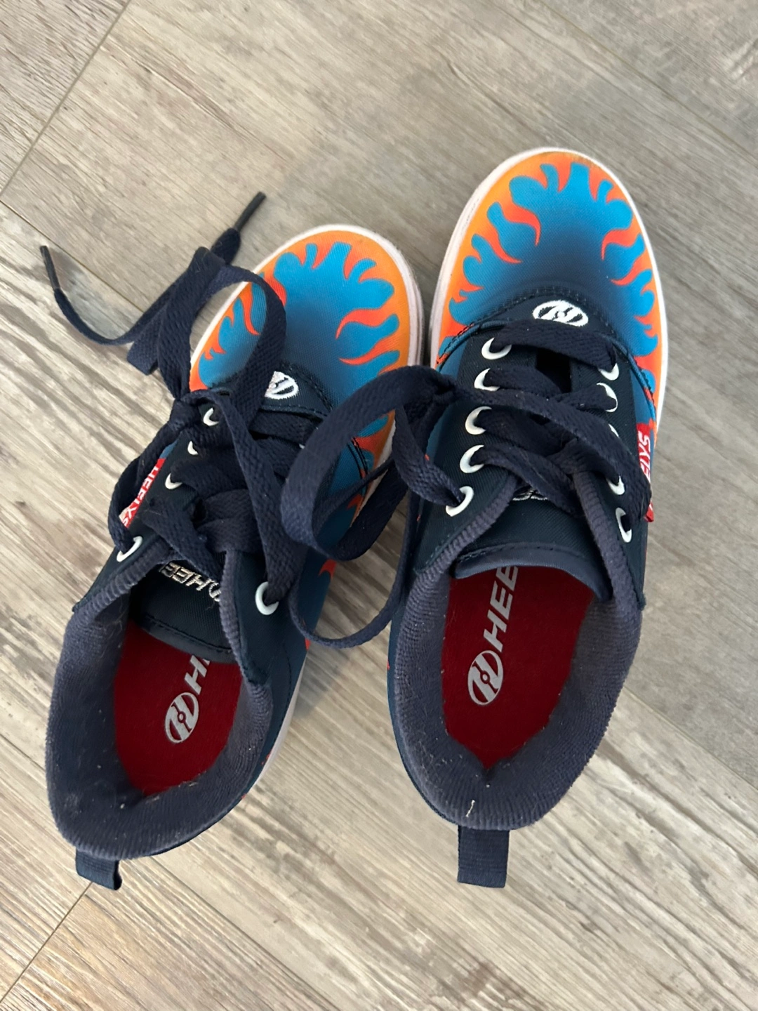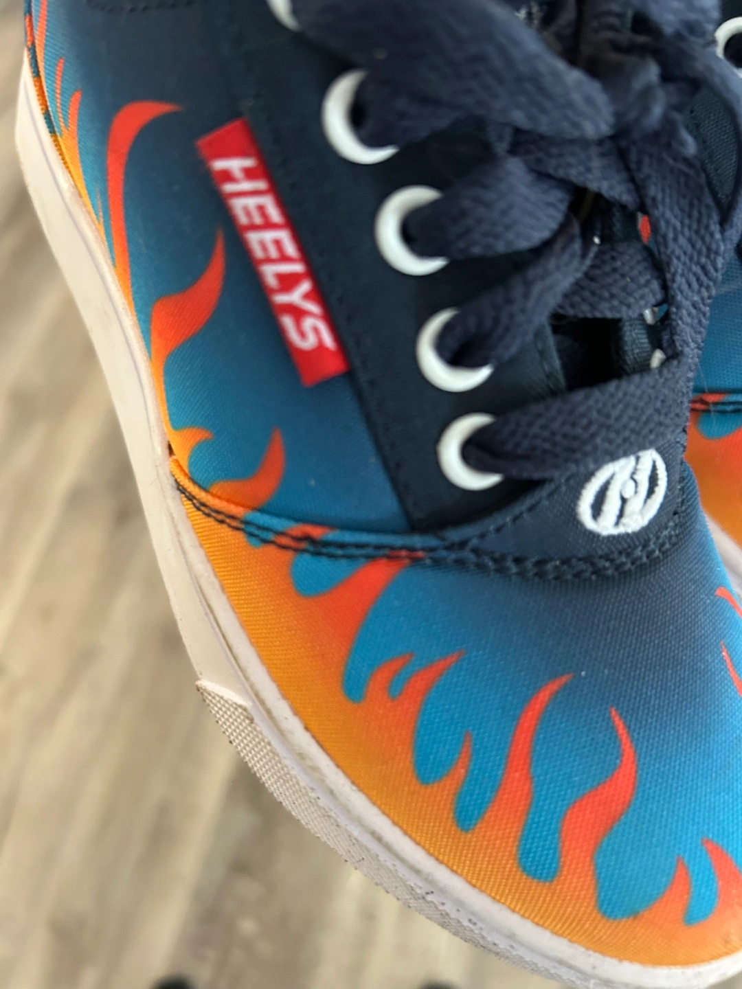 Youth size 1 Heelys roller shoes. Flame print design. Navy blue, orange, and yellow colours. Both shoes and Wheels in excellent like new condition. Worn once. Comes in original box.