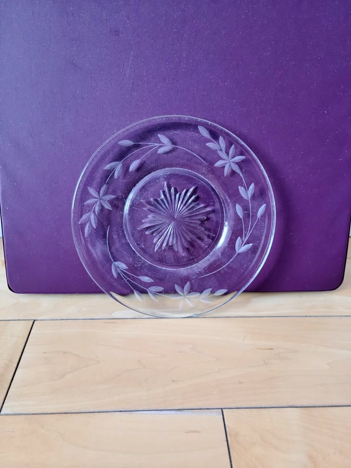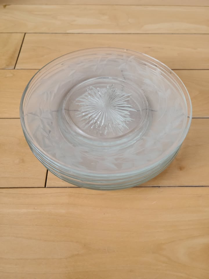 Selling a set of 6 unmarked pressed glass dessert plates. Clear glass, plates measure 6" in diameter. The outer rim is decorated in a band of etched flowers. The centre is a pressed relief star/sun burst. Plates are in great condition. Comes from a smoke & pet free home.