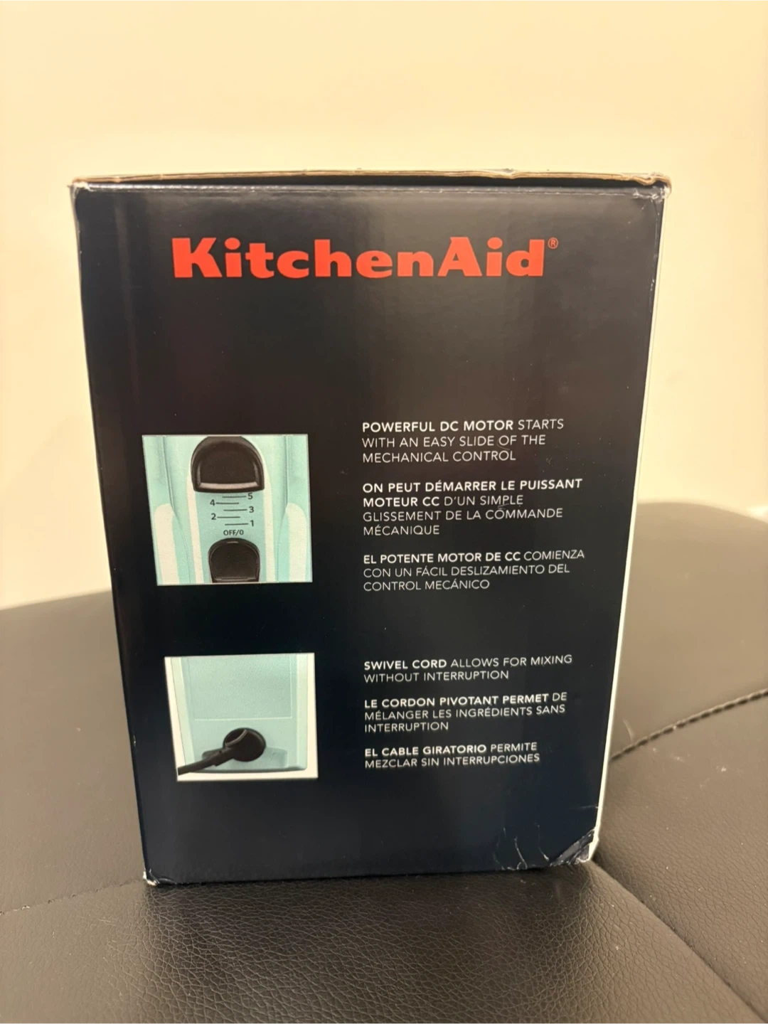 This KitchenAid hand mixer comes in a lovely Ice Blue colour. It's a 5-speed model with Turbo Beater accessories. The powerful DC motor starts with an easy slide of the mechanical control.