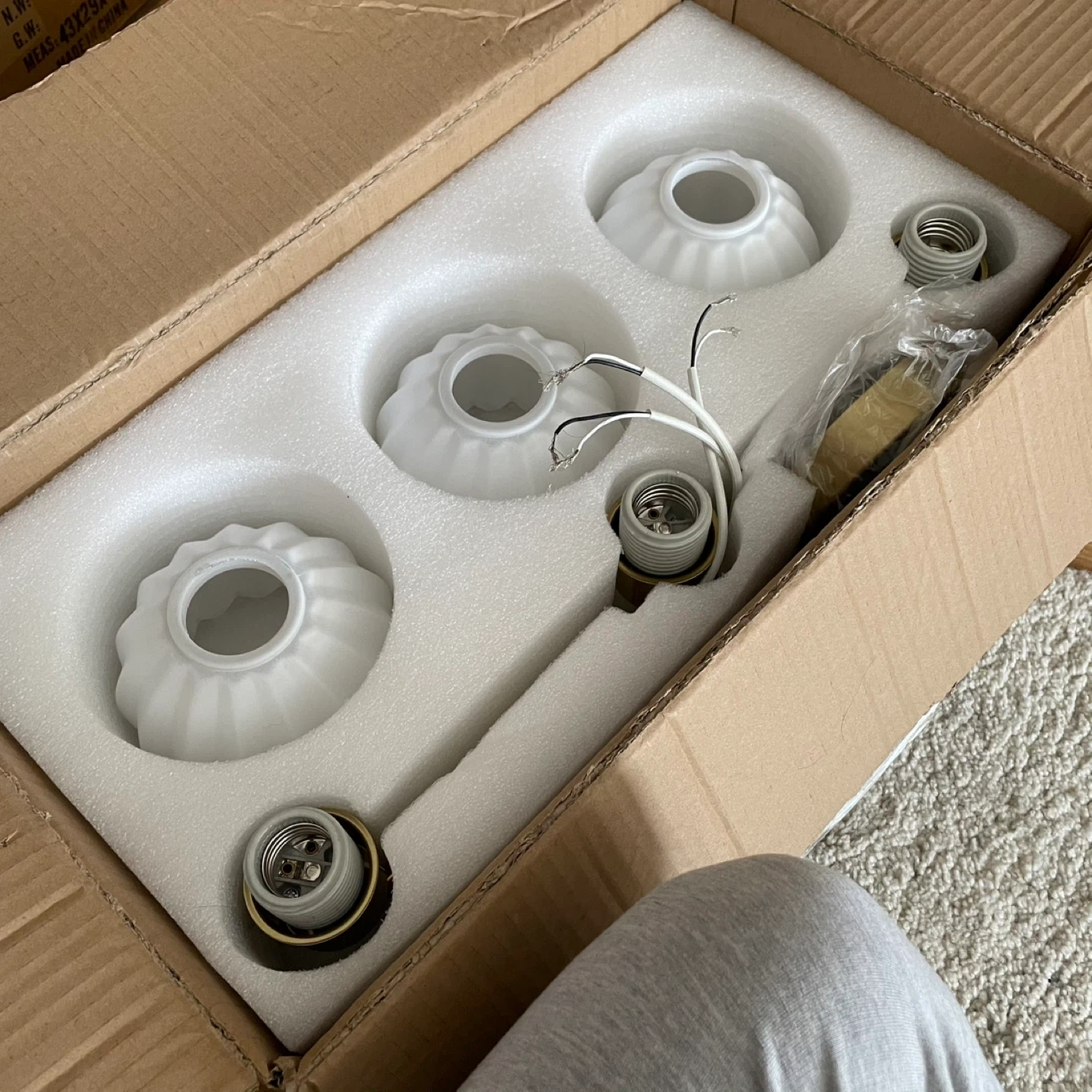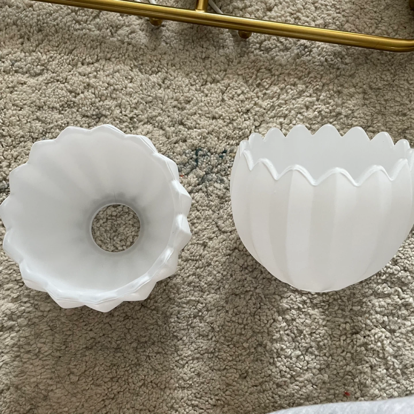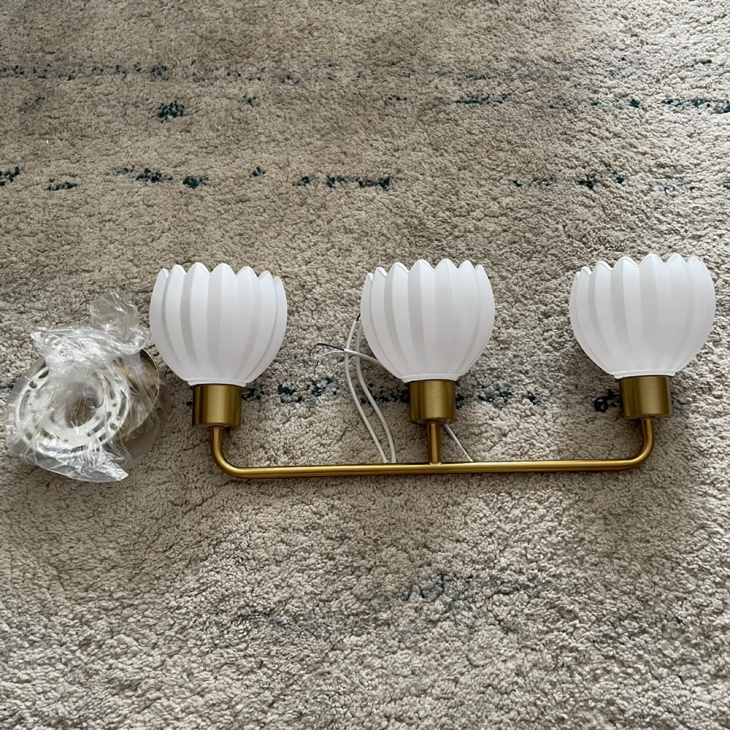This vanity light fixture features three white glass shades with a gold finish base. It includes all necessary mounting hardware for installation. It's suitable for bathrooms or hallways.