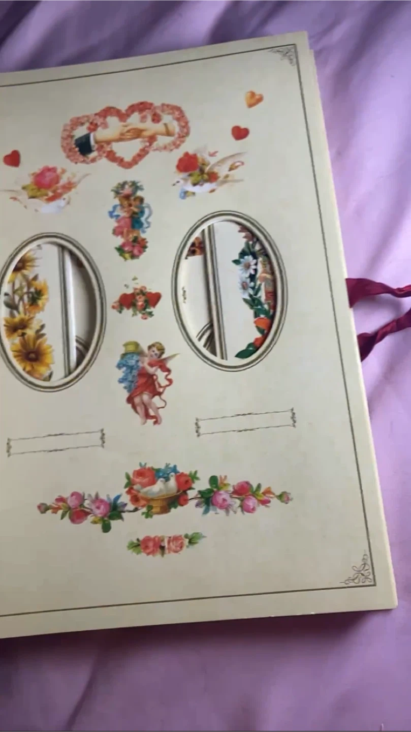 A beautiful Victorian-themed photograph album. It features charming cherub and floral designs throughout. This album is perfect for preserving your cherished memories! (Karrot doesn’t like videos so I took screenshots from the video of inside the book)