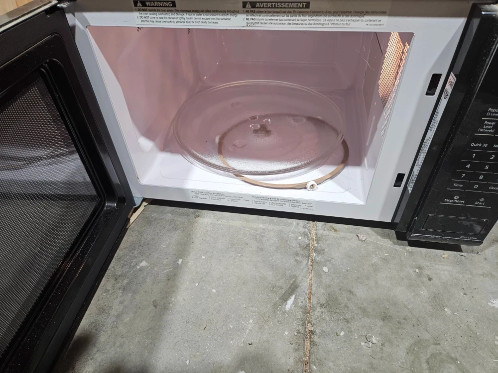 This is a black Panasonic microwave oven. It has a glass turntable inside. Comes with the power cord attached.