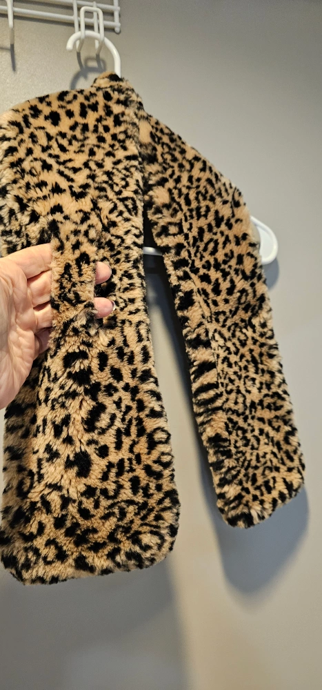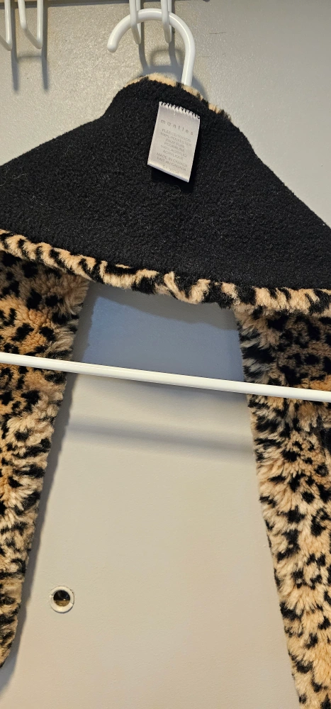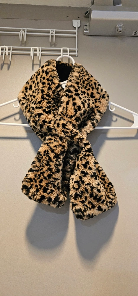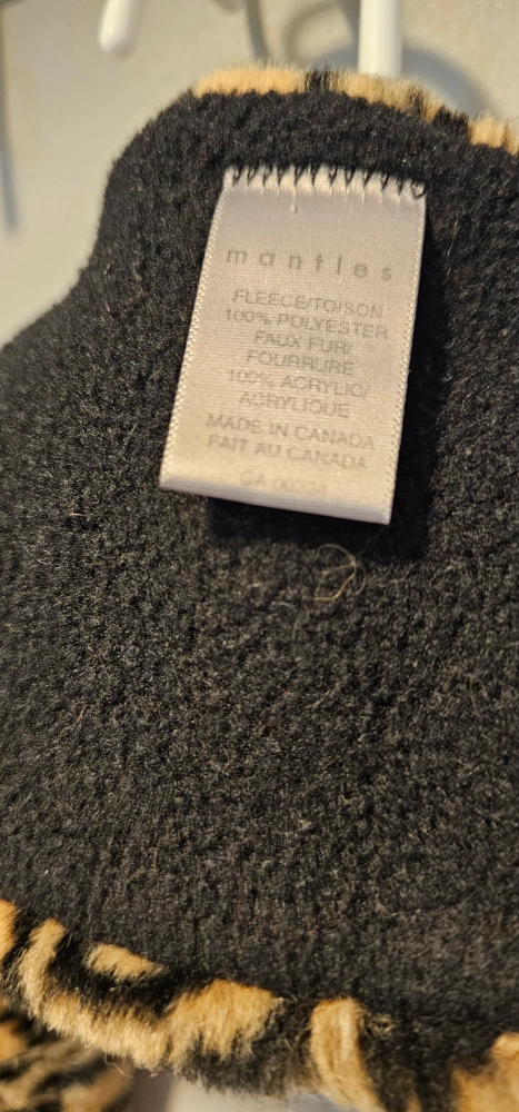 Snuggle up in this stylish Mantles scarf! It features a fun leopard print on faux fur, with a cozy black fleece backing. The tag indicates it's made in Canada from 100% polyester faux fur and 100% acrylic.