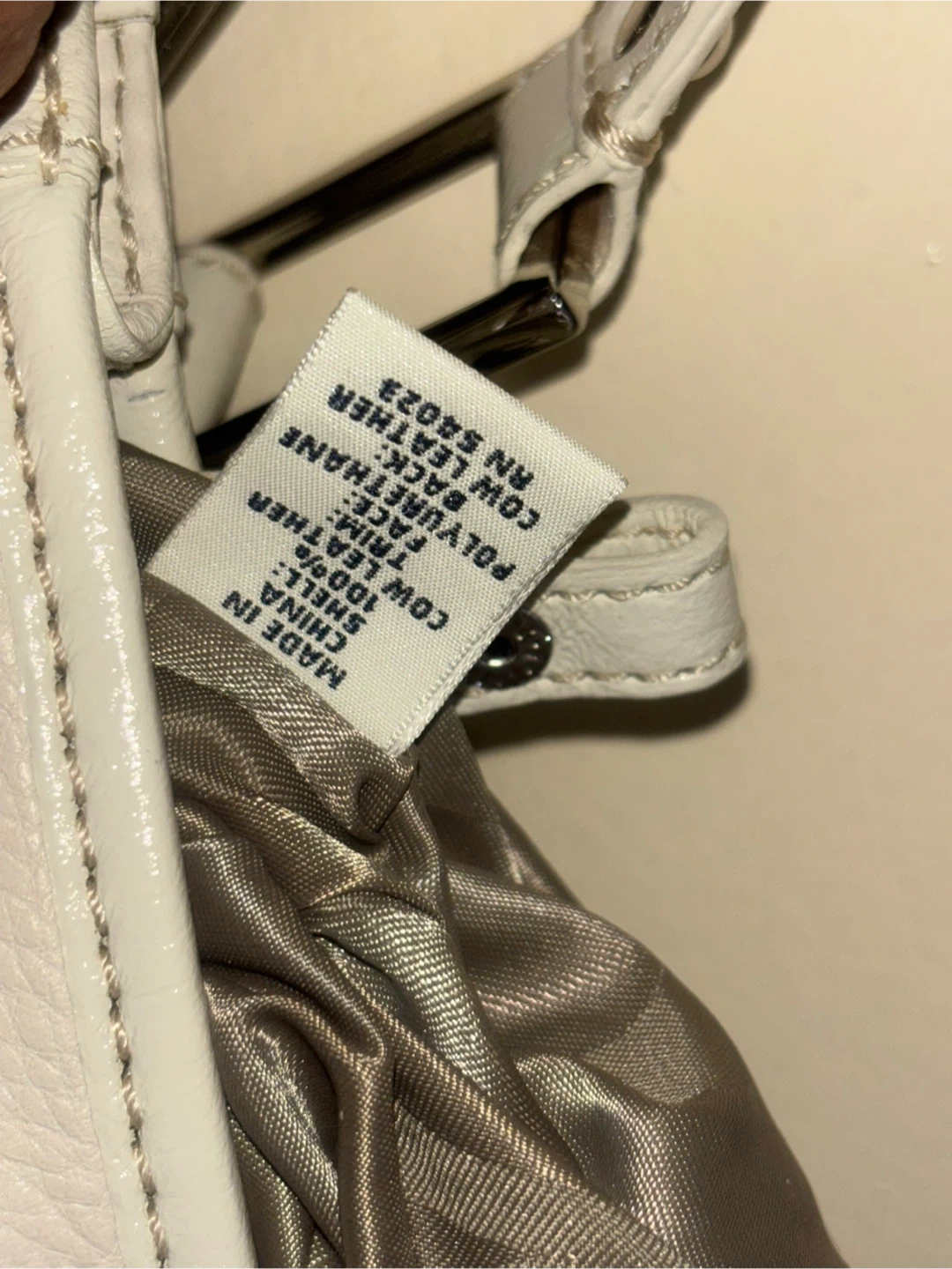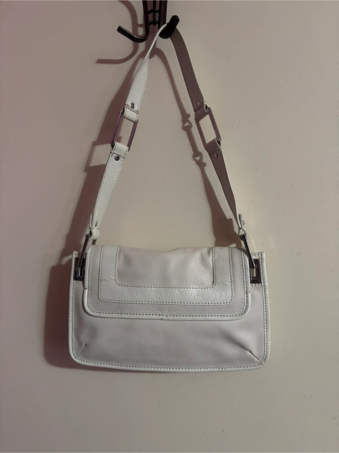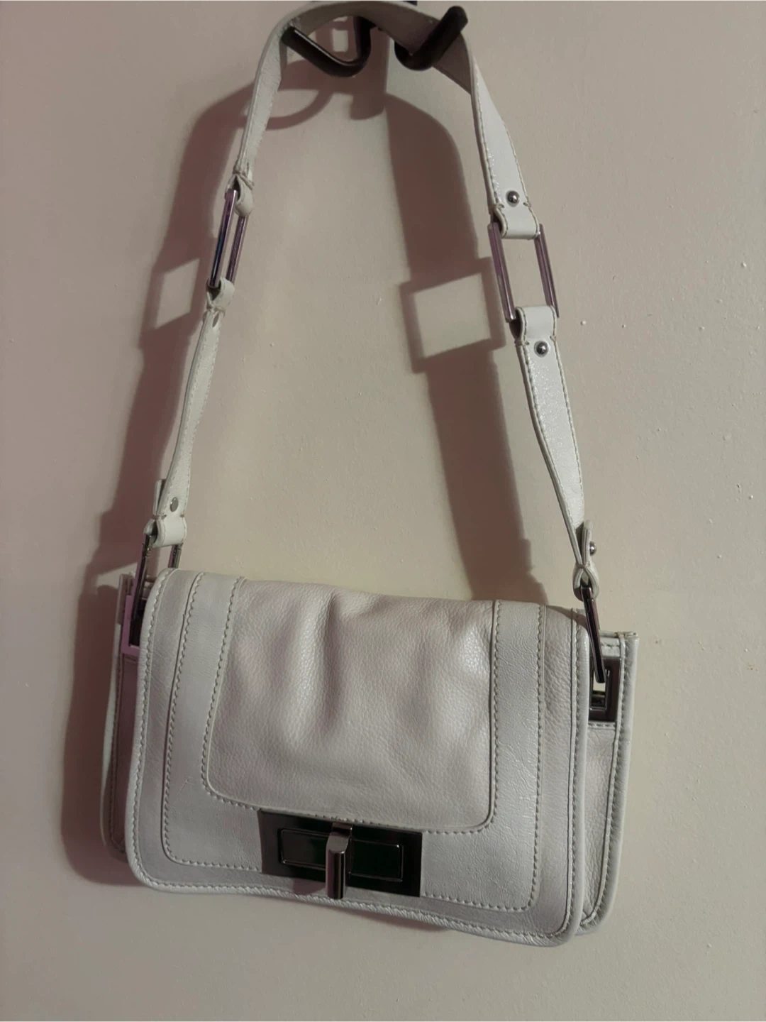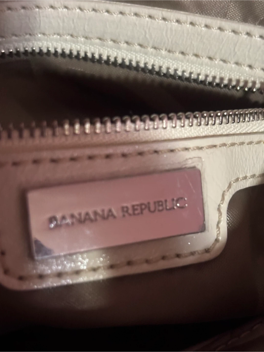 This is a white leather shoulder bag from Banana Republic. It's made with 100% cow leather. The bag has a classic flap closure and silver-tone hardware.