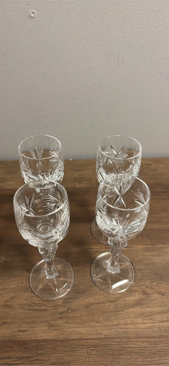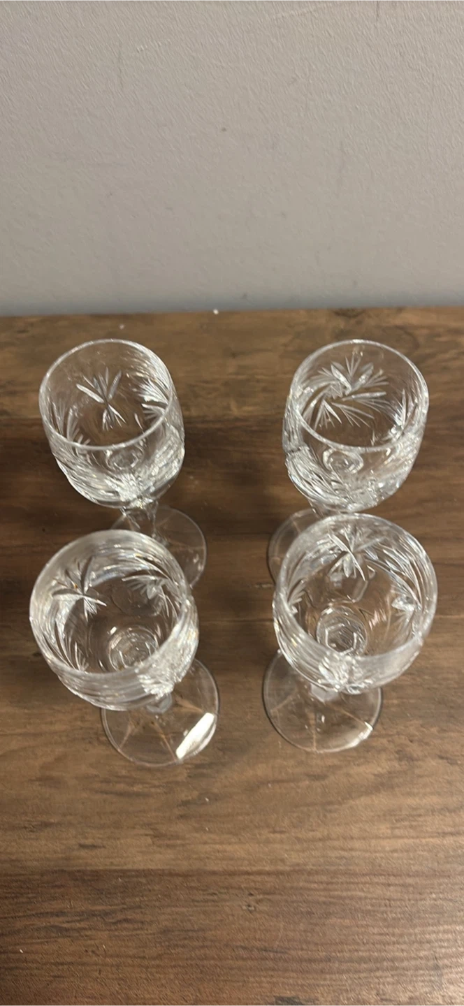 These are four delicate cordial glasses featuring intricate starburst cut patterns. Made of clear crystal glass with detailed stems. Perfect for serving spirits or liqueurs at gatherings!