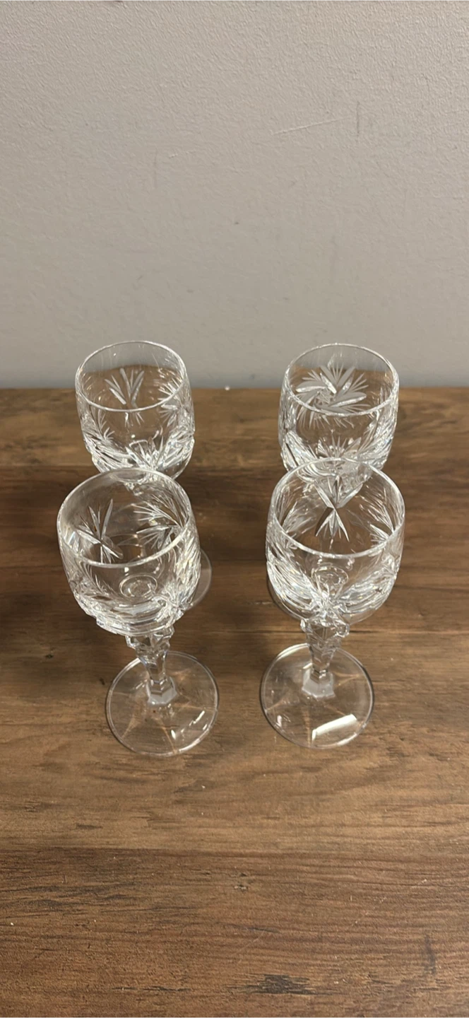 These are four delicate cordial glasses featuring intricate starburst cut patterns. Made of clear crystal glass with detailed stems. Perfect for serving spirits or liqueurs at gatherings!