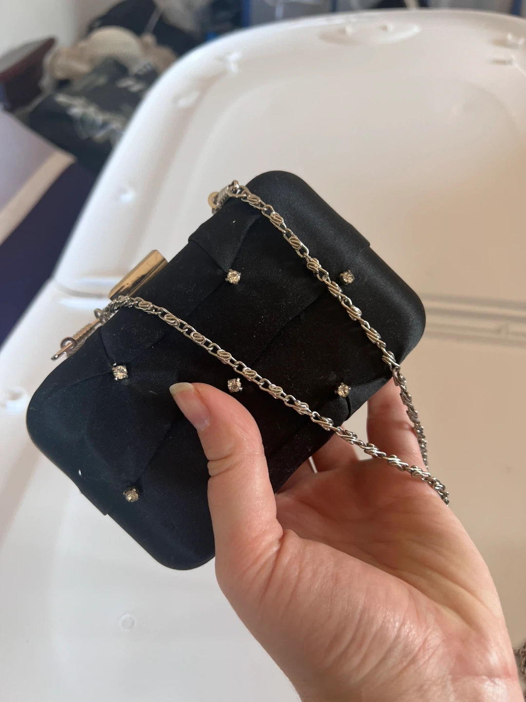This black clutch bag features a ruched satin exterior with scattered rhinestones. It comes with a detachable silver chain strap. Perfect for evening events!