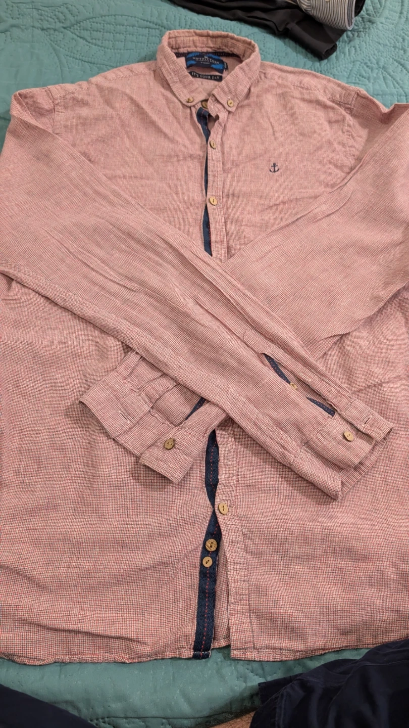 Outfitters authentic brand long-sleeve button-up shirt in a size XL. It's a reddish-pink checkered pattern with navy blue accents on the collar and cuffs. Made for comfortable, casual wear.