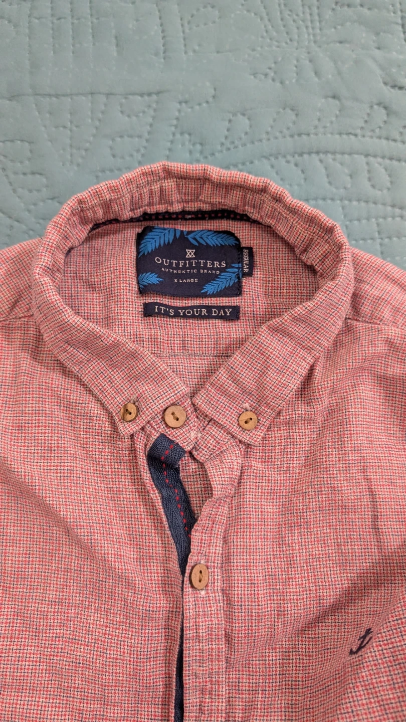 Outfitters authentic brand long-sleeve button-up shirt in a size XL. It's a reddish-pink checkered pattern with navy blue accents on the collar and cuffs. Made for comfortable, casual wear.