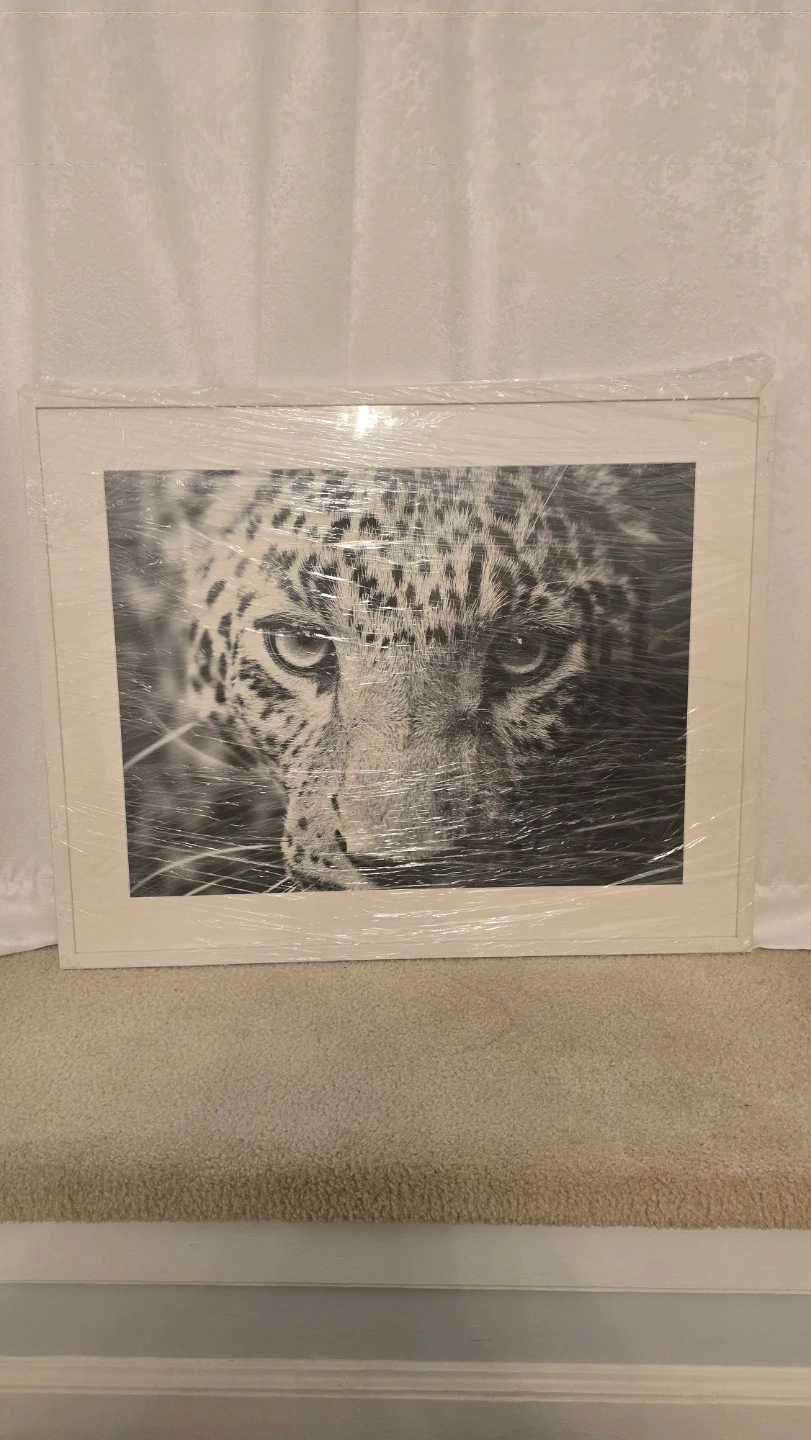 Selling a framed leopard print from Framebridge. It's in great condition and ready to hang in your home. The frame is a clean white color that complements the black and white print perfectly. Adds a touch of wild elegance to any room!