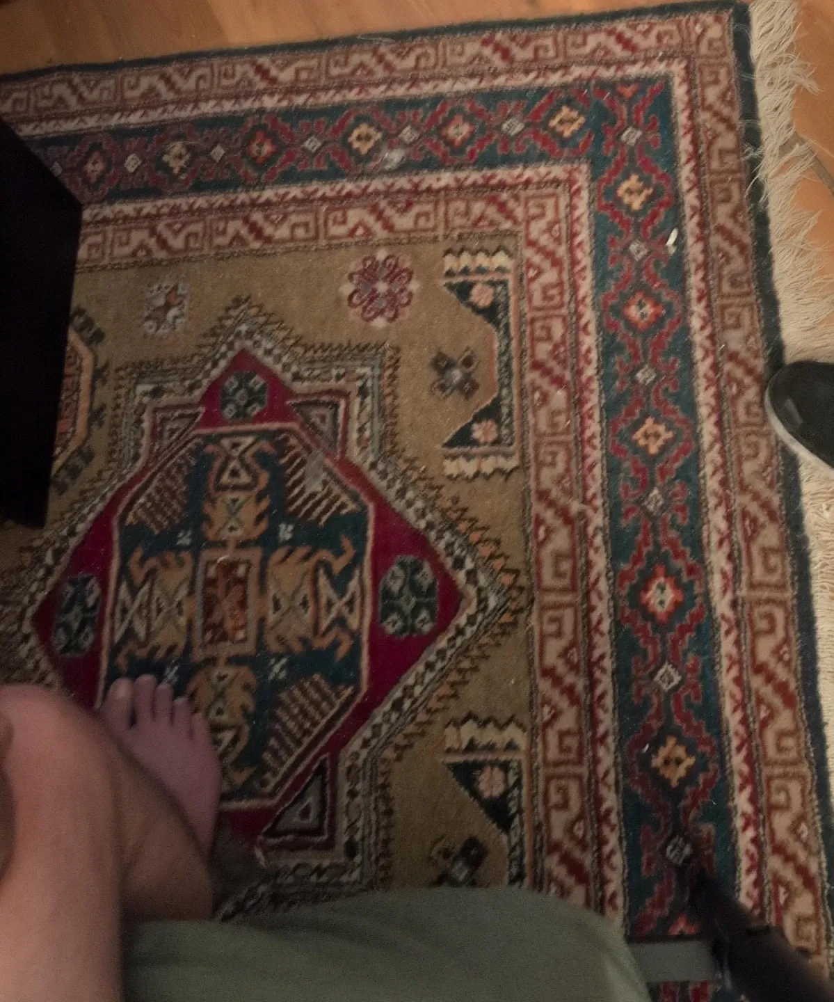 This area rug features a traditional geometric pattern in earthy tones. It's a great accent piece for any room. Material appears to be a wool blend.