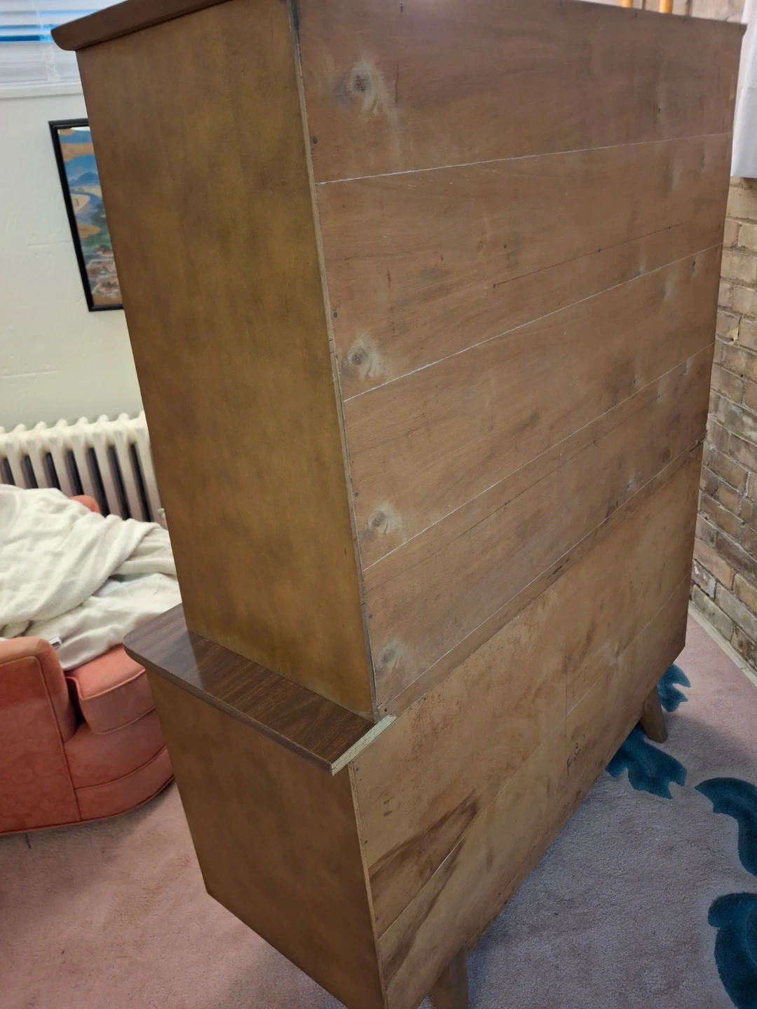 This hutch features a wooden frame with a mid-century modern design. It has two glass sliding doors on the top section and two shelves. The bottom section includes a sliding glass door on the left and a diamond-patterned cabinet door on the right, with a built-in drawer with dividers. It is 58 inches tall, 47 inches wide and 17 inches deep. The top section can be easily removed which makes transportation easy. Solid wood!