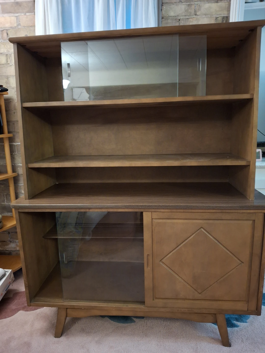 This hutch features a wooden frame with a mid-century modern design. It has two glass sliding doors on the top section and two shelves. The bottom section includes a sliding glass door on the left and a diamond-patterned cabinet door on the right, with a built-in drawer with dividers. It is 58 inches tall, 47 inches wide and 17 inches deep. The top section can be easily removed which makes transportation easy. Solid wood!