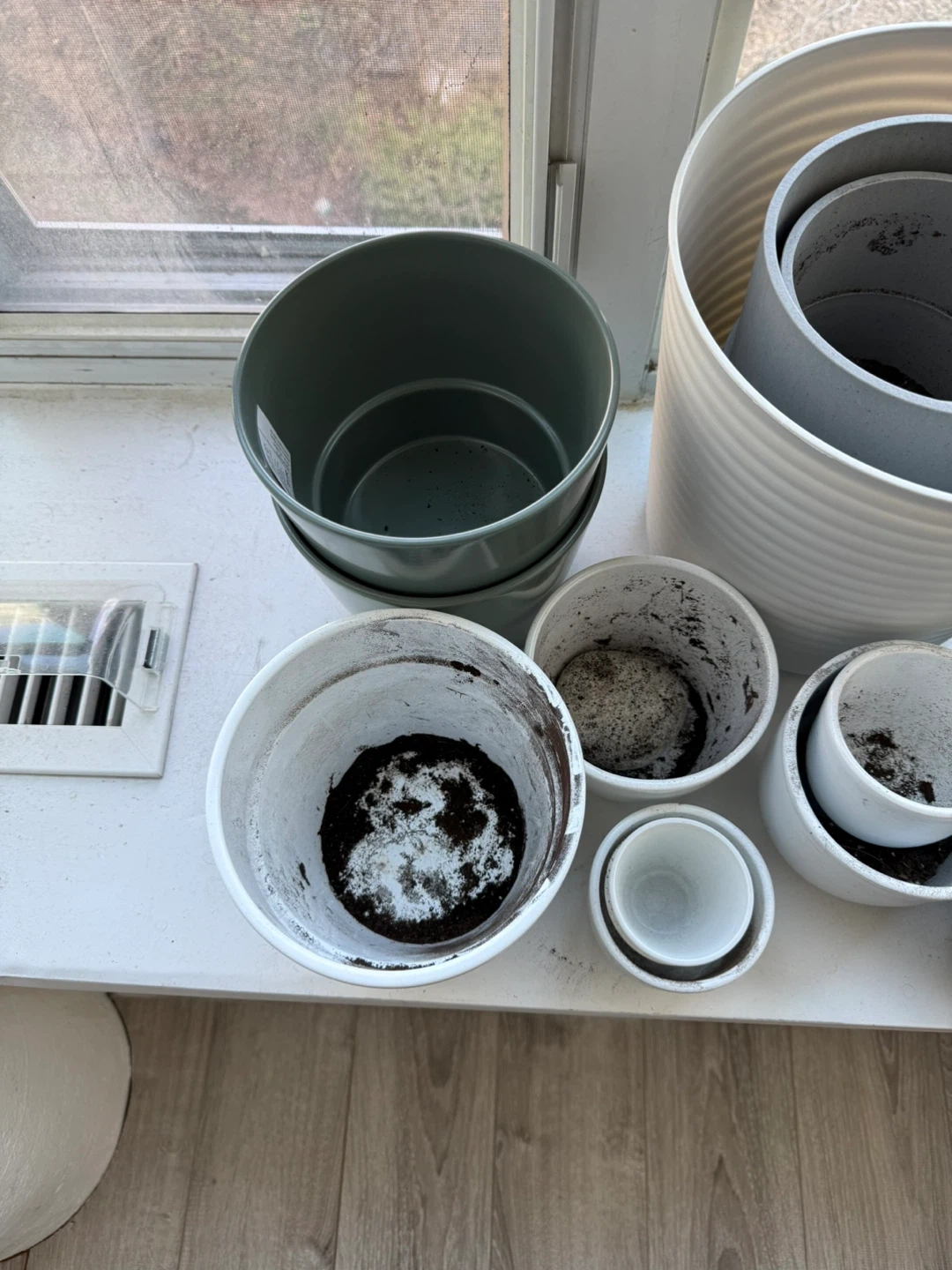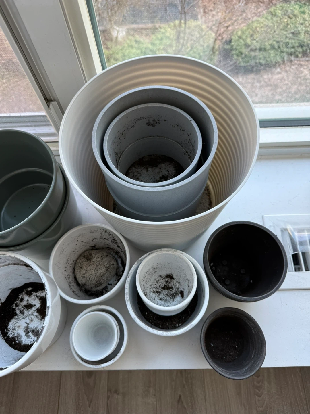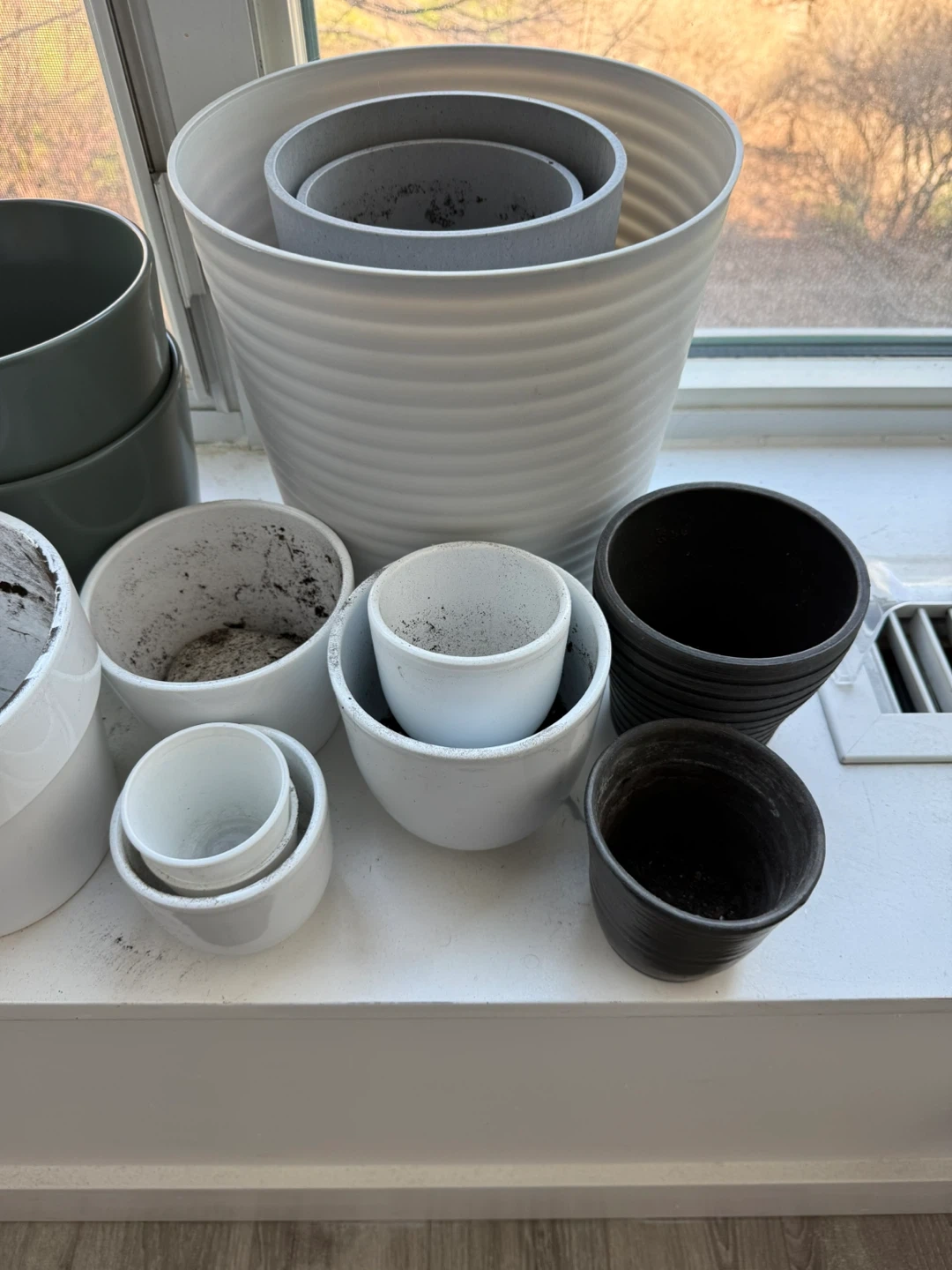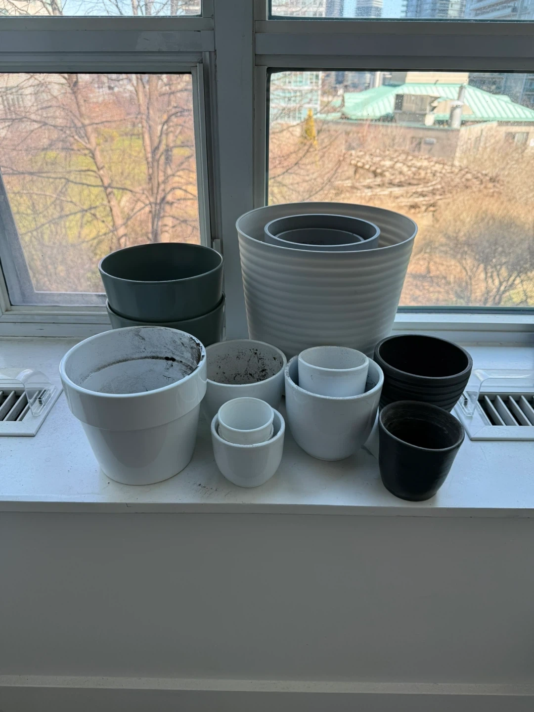 A collection of assorted plant pots in various sizes and colours, including white, grey, and dark green. Perfect for your indoor or outdoor gardening needs!
