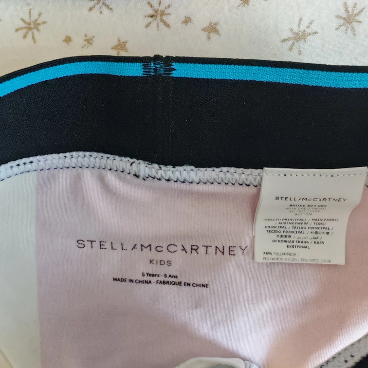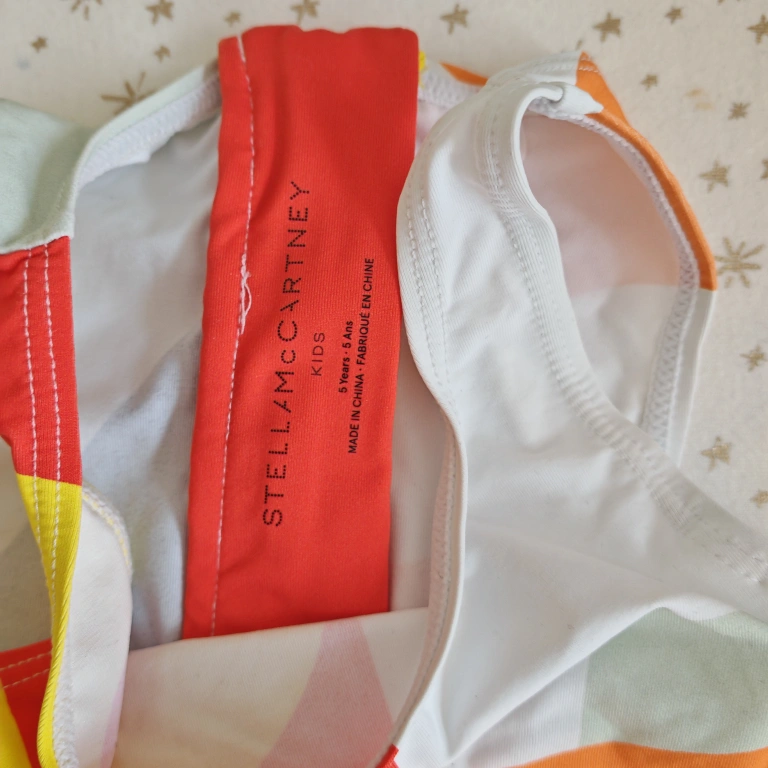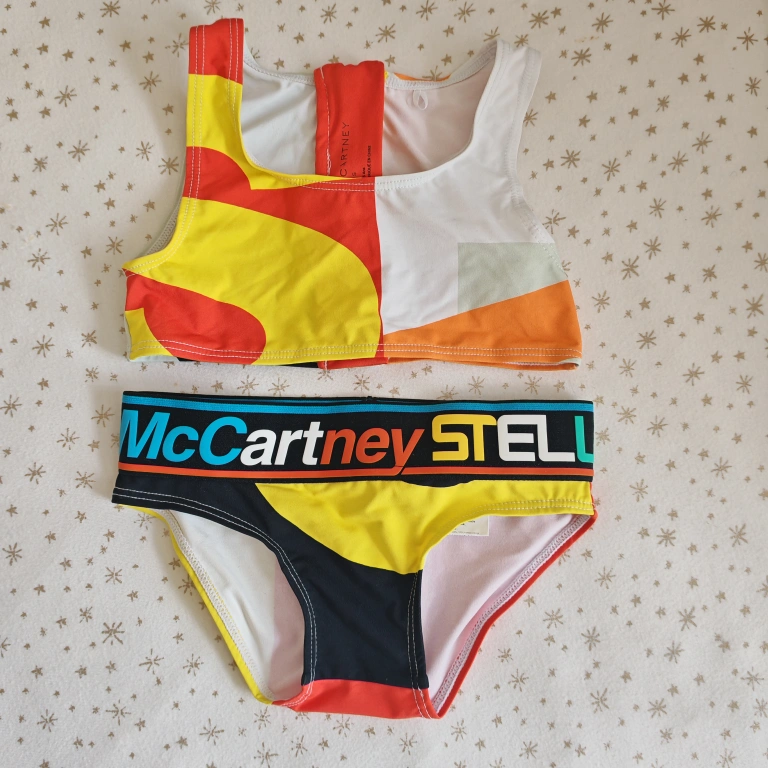 This Stella McCartney Kids swimsuit is in great condition and ready for some fun in the sun! It's a vibrant, colourful two-piece set with the brand name prominently displayed on the bottoms. The size is 5 years.