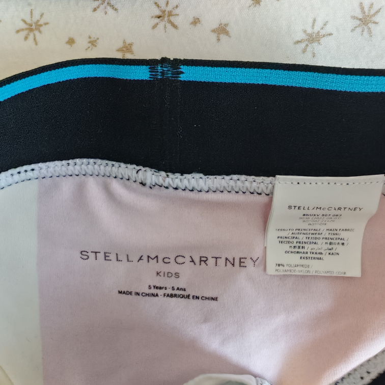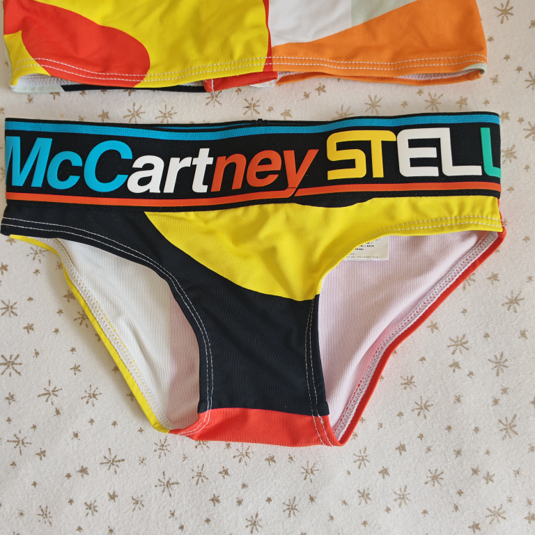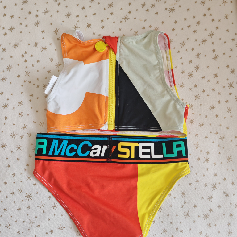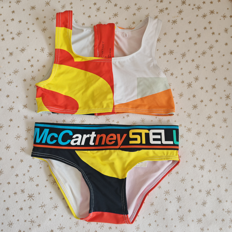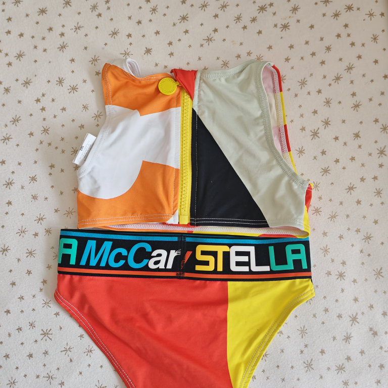 This Stella McCartney Kids swimsuit is in great condition and ready for some fun in the sun! It's a vibrant, colourful two-piece set with the brand name prominently displayed on the bottoms. The size is 5 years.