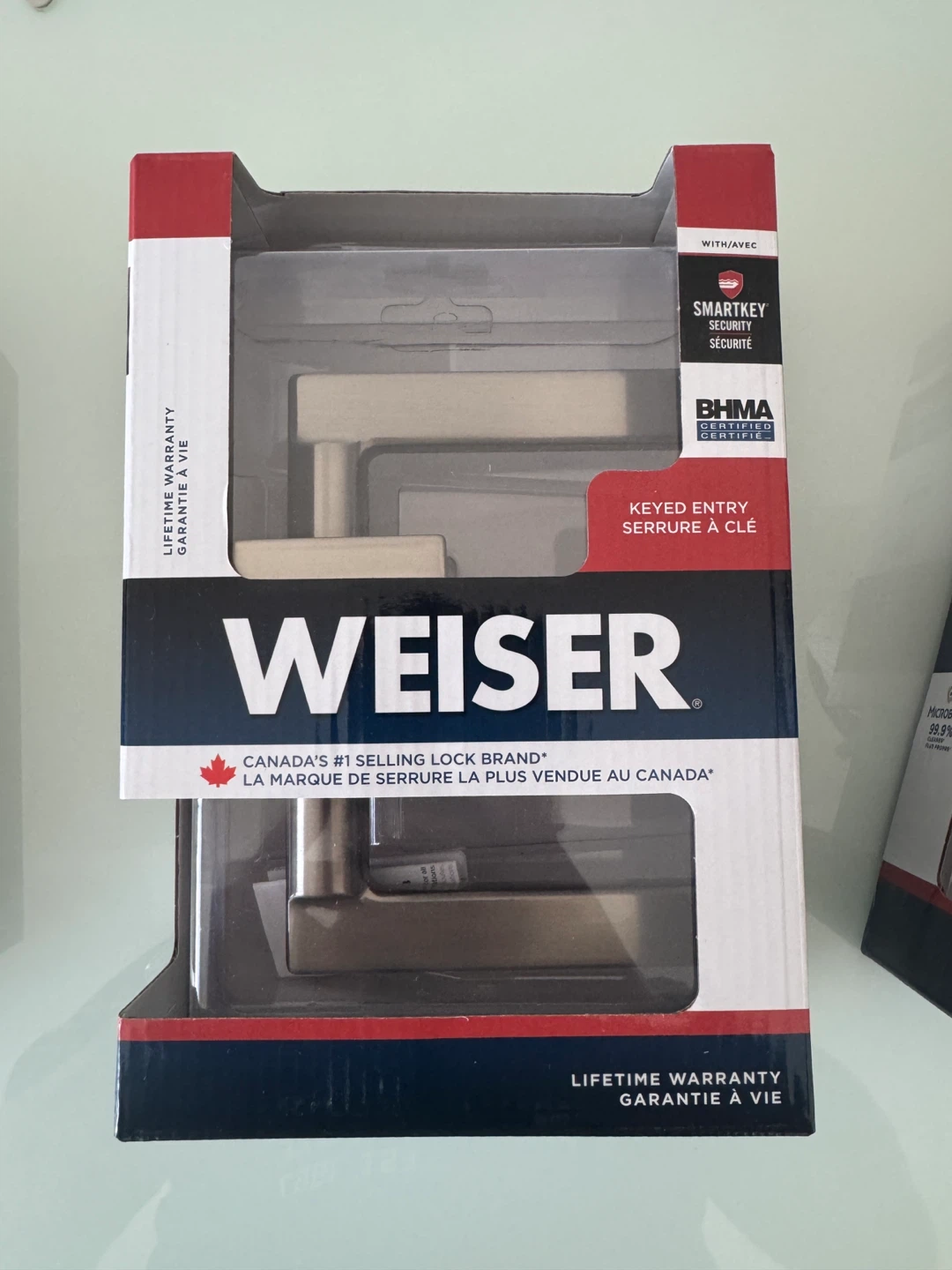 New Weiser no key entry door handle set. Fits all standard doors and compatible with standard backsets. Features Microban antimicrobial protection for 99.9% cleaner surfaces. Includes a lifetime warranty.
