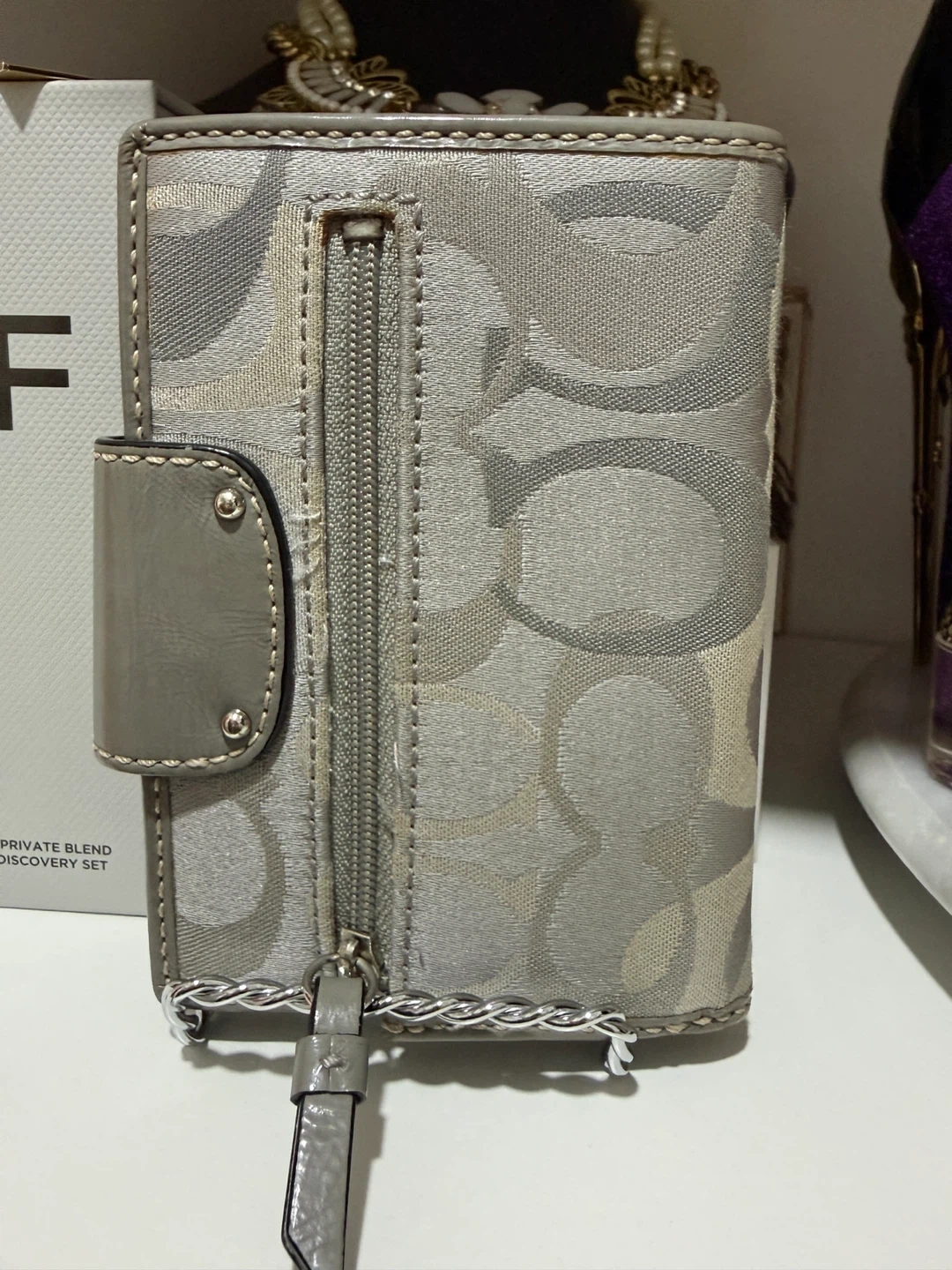 Grey and silver Coach trifold wallet with signature "C" pattern. It features a snap closure and a zippered coin pocket. Multiple card slots and an ID window inside.