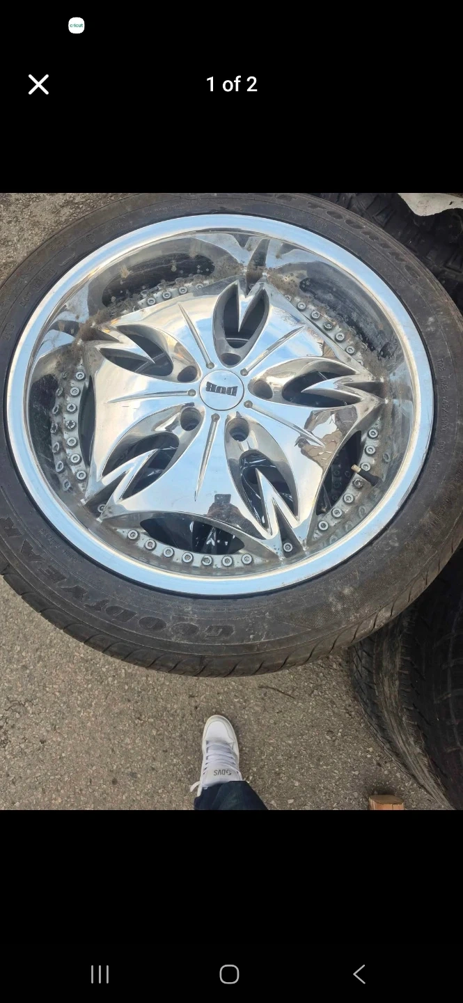 Four shiny chrome alloy wheels with tires. The wheels feature a star-shaped spoke design with polished accents. This set is suitable for vehicles that can accommodate this style of rim.