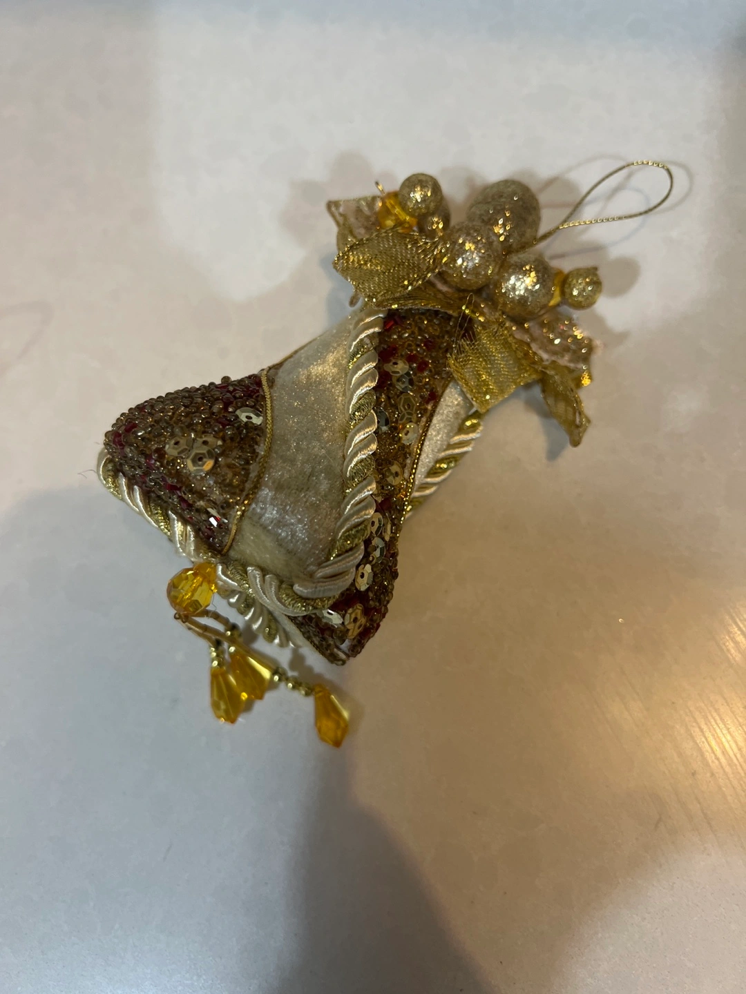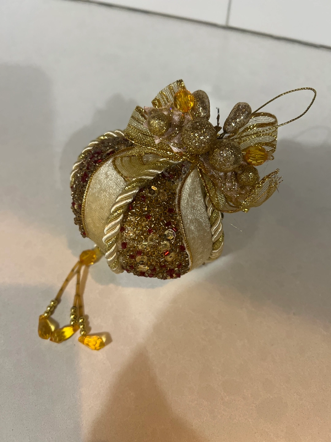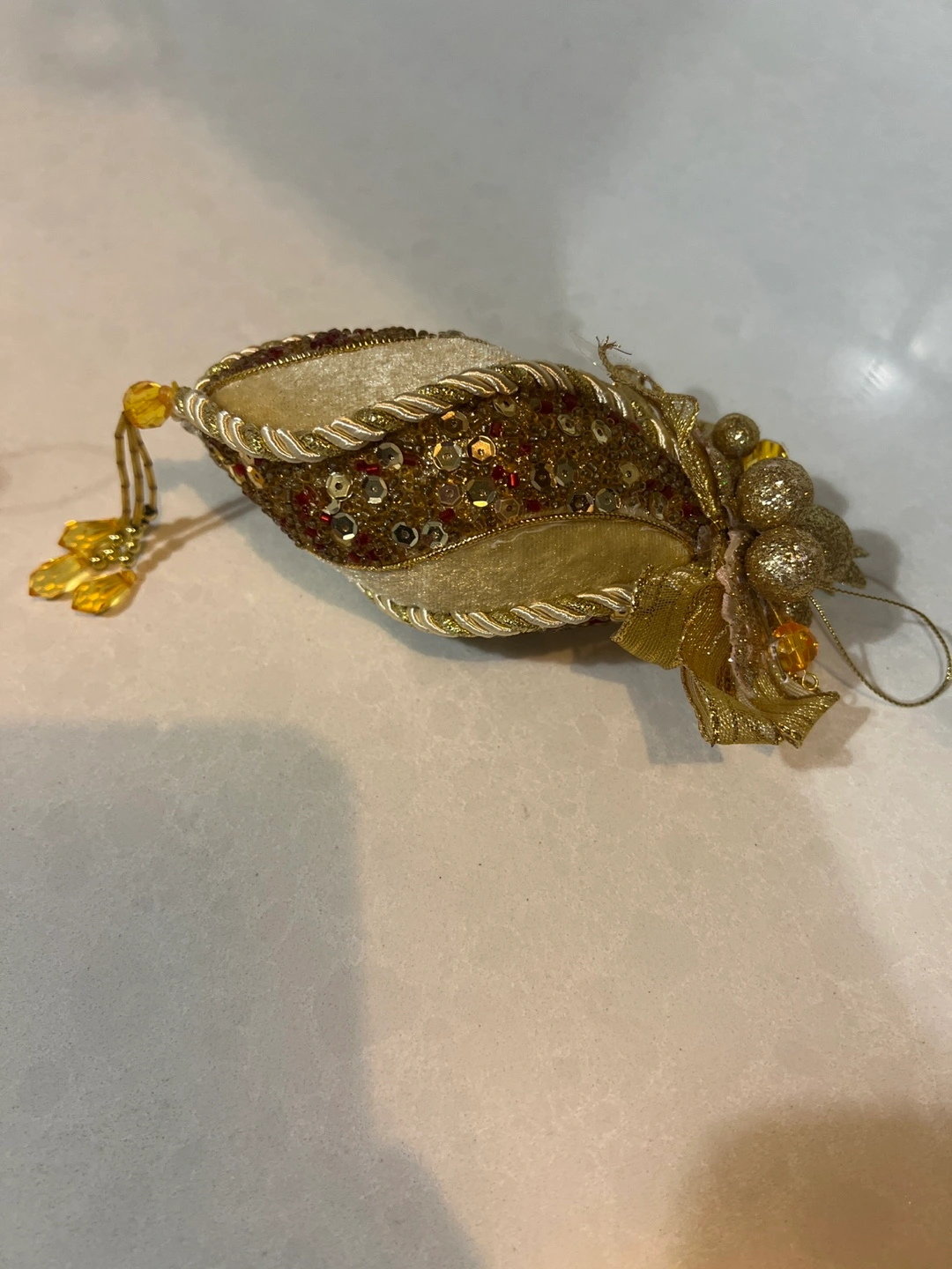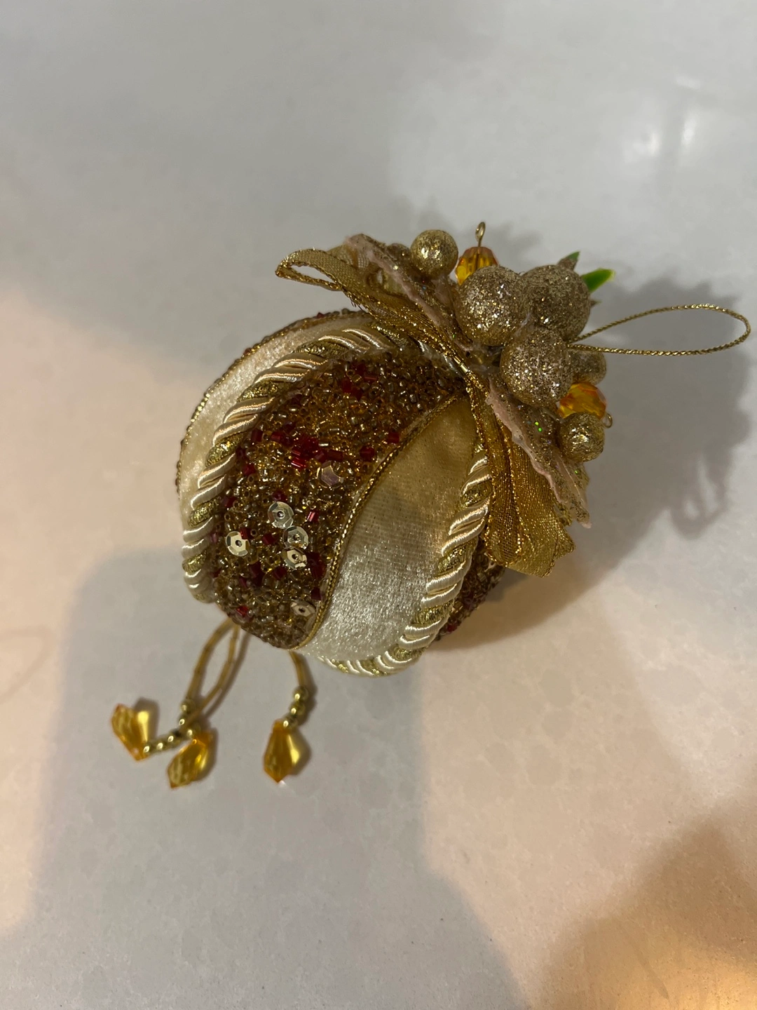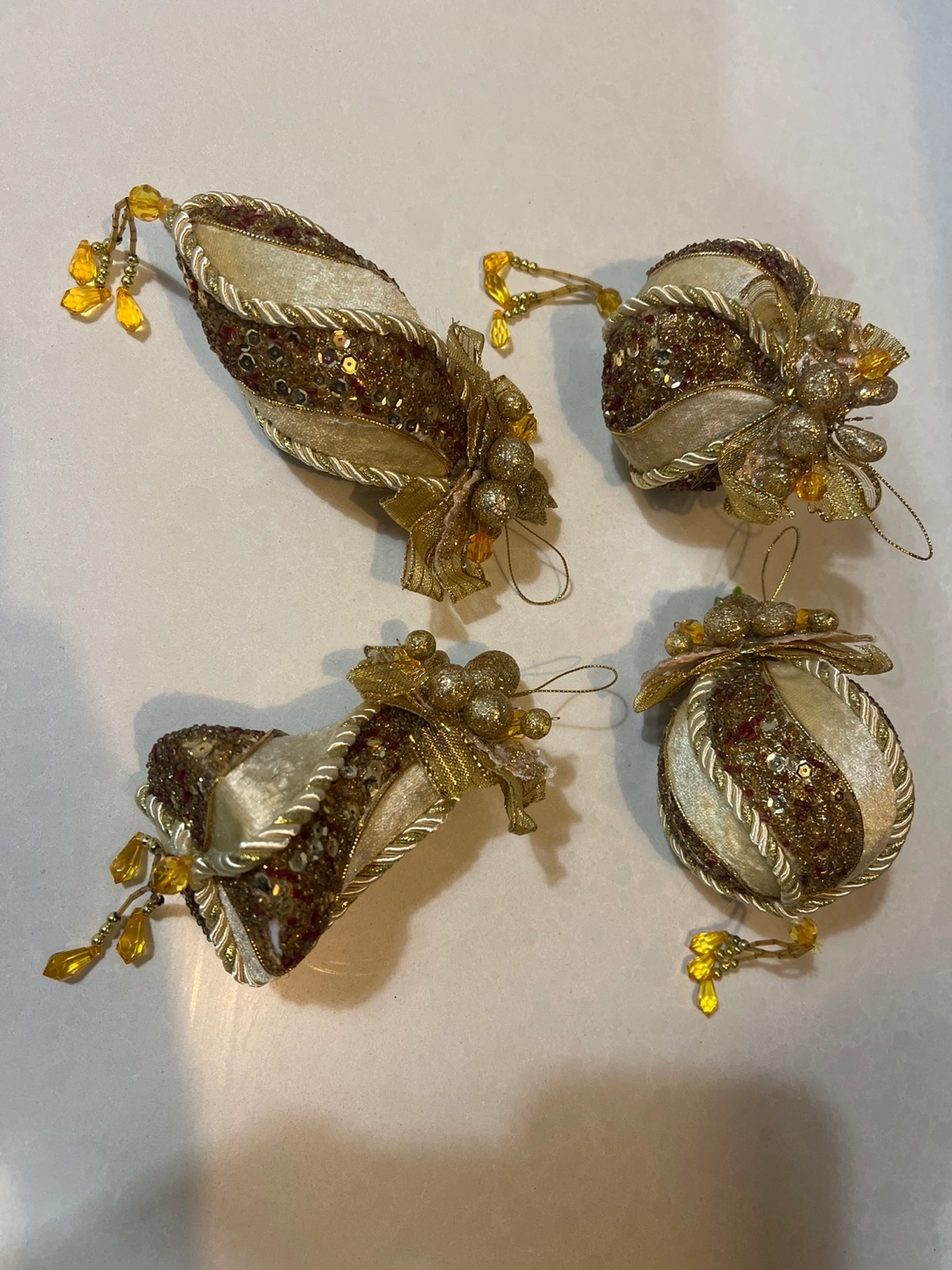 Four beautiful Christmas ornaments. Gold and cream velvet with gold and red sequins. Each ornament has a gold ribbon and beaded accents. Perfect for a Christmas tree!