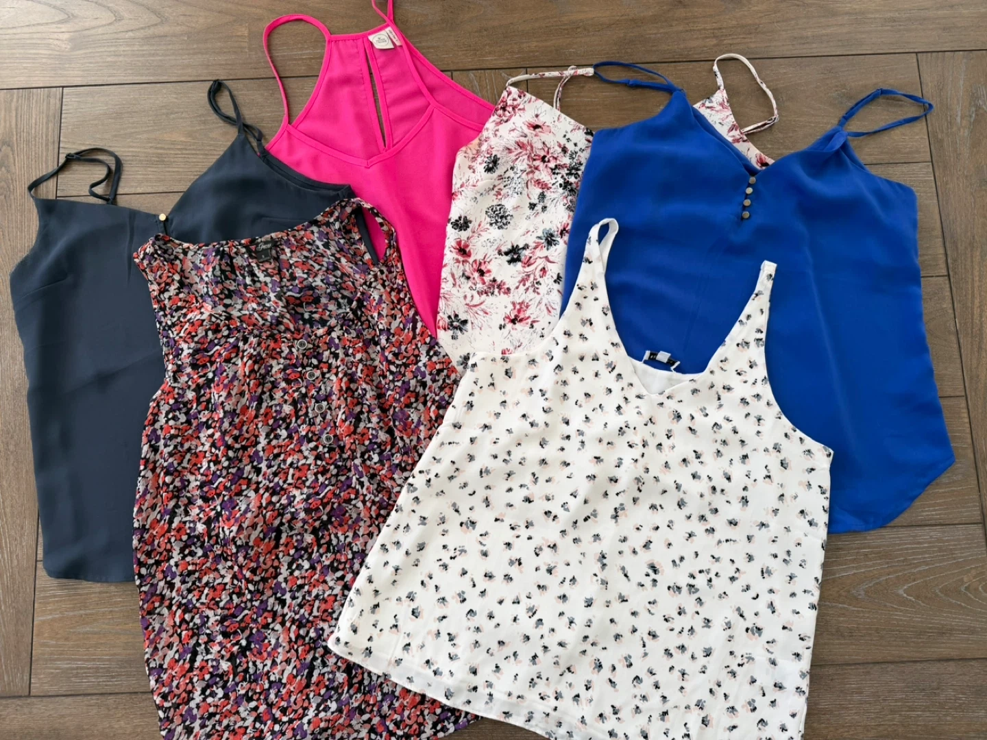 This bundle includes six women's camisoles in different colours and prints. They are all sleeveless with spaghetti straps.
