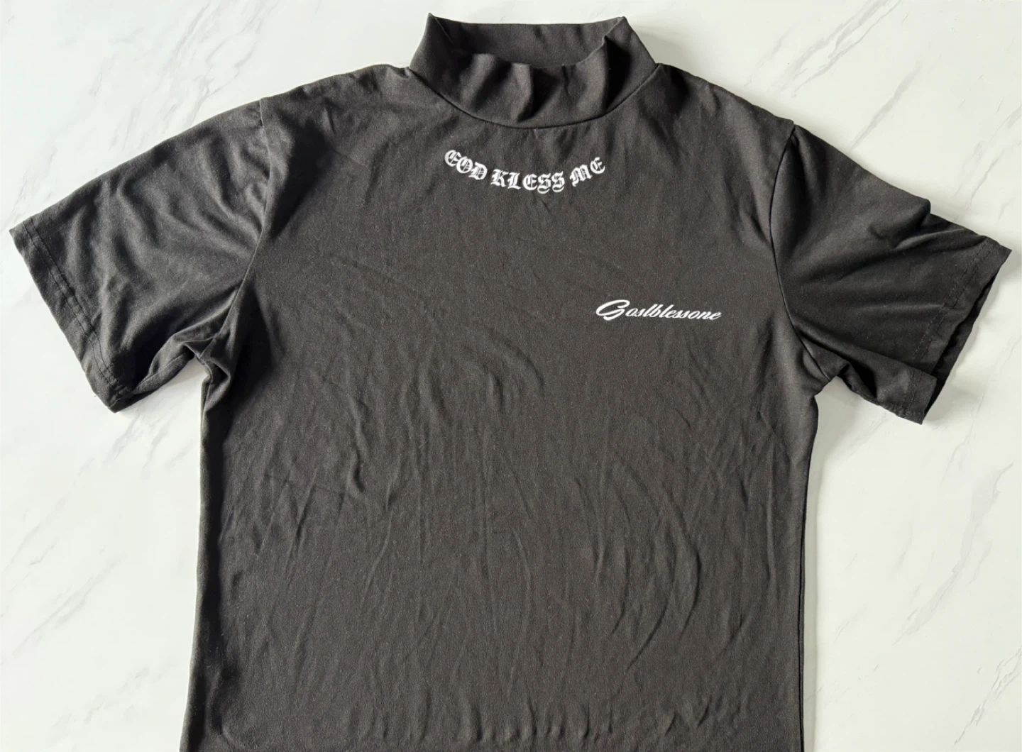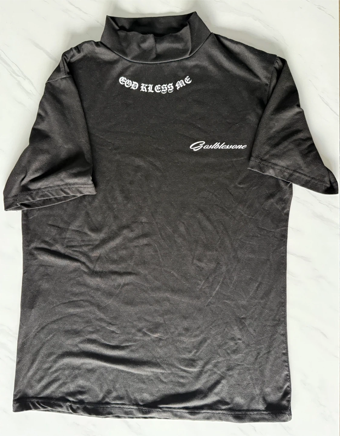 Buy & SellBlack Mock Neck Graphic T-ShirtBlack Mock Neck Graphic T-Shirt$10Black short sleeve mock neck t-shirt with "God Bless Me" graphic. Made of 90% polyester and 10% spandex. Machine wash cold.ConditionLike newSizeSBrandGasblessoneWHERE TO MEETLefrack CityView MapSELLERverifiedOmarCorona600 reviews0 chats·0 favorites·3 viewsSEND CHAT TO SELLERHi Omar! I’m interested in your listing.Hi Omar! I’m interested in your listing.Get the Karrot app to chatSign In to chat