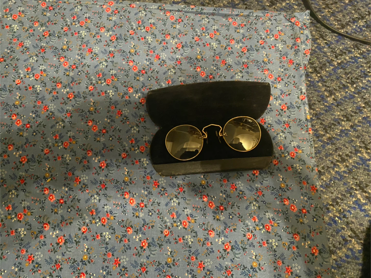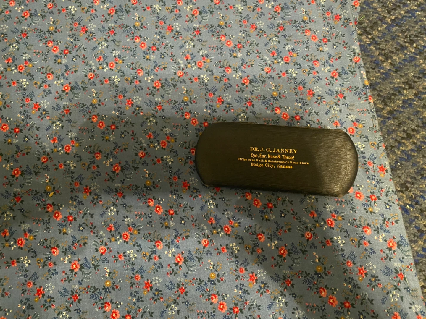 Selling a pair of vintage round sunglasses. They come in a case from DR.J.G. JANNEY Eye, Ear, Nose & Throat Office in Heath & Esterbrook's Drug Store Dodge City, Kansas